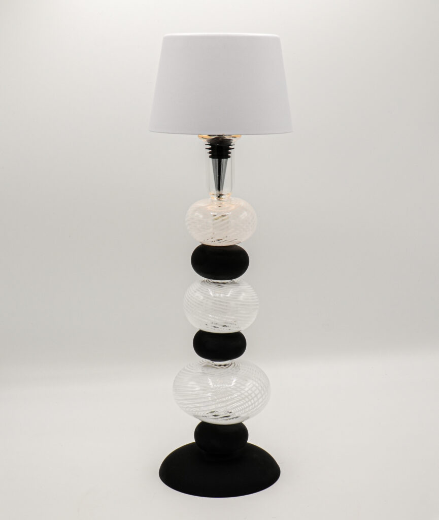 Modern lamp that can also become a candlestick made of flattened filigree balls and satin black balls