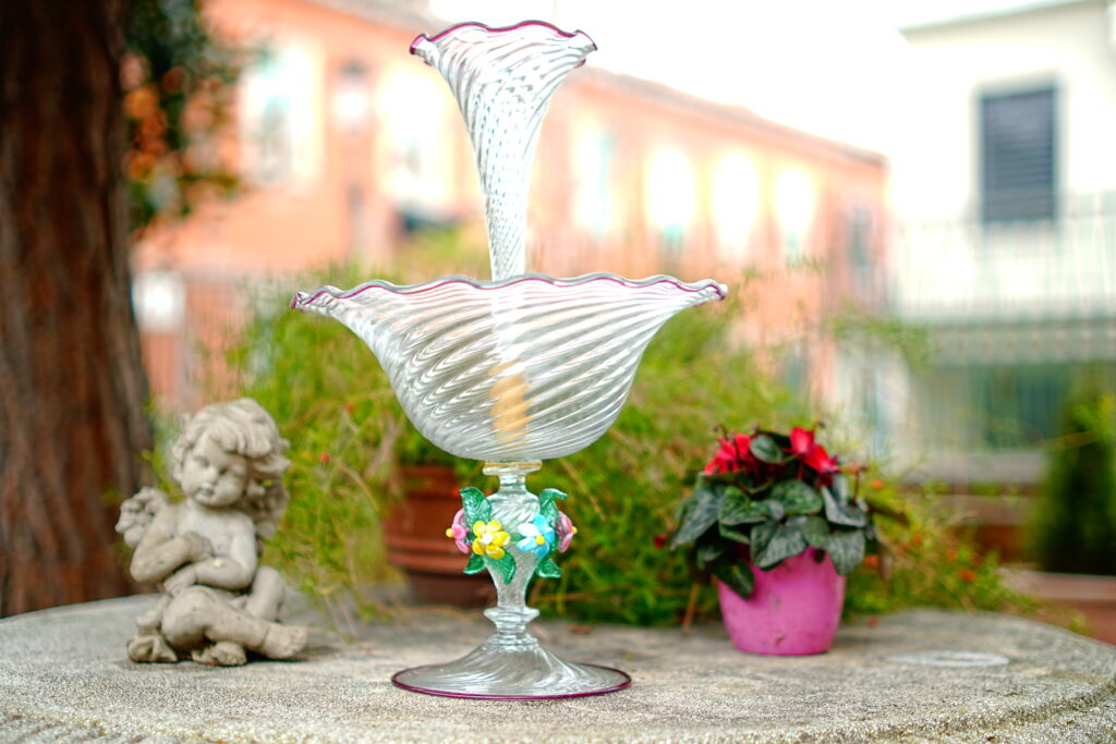 Collectible vase from the 80s, made with shaded powders of different colors and green flower-shaped murrine with a red central point.