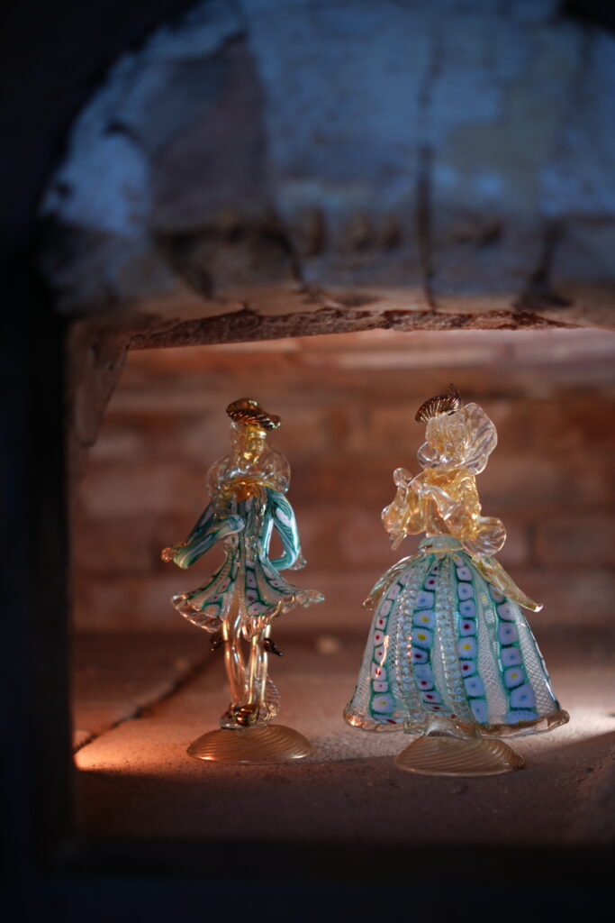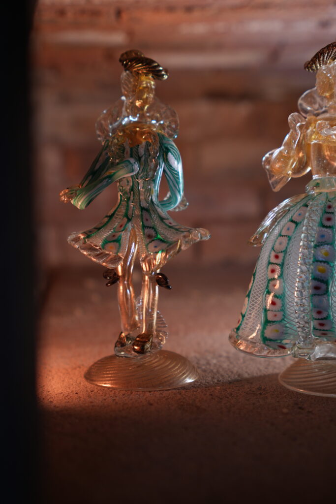 Small pair of Venetian figurines made with white filigree cane and murrine of various colors, body in 24 carat gold. Collectibles