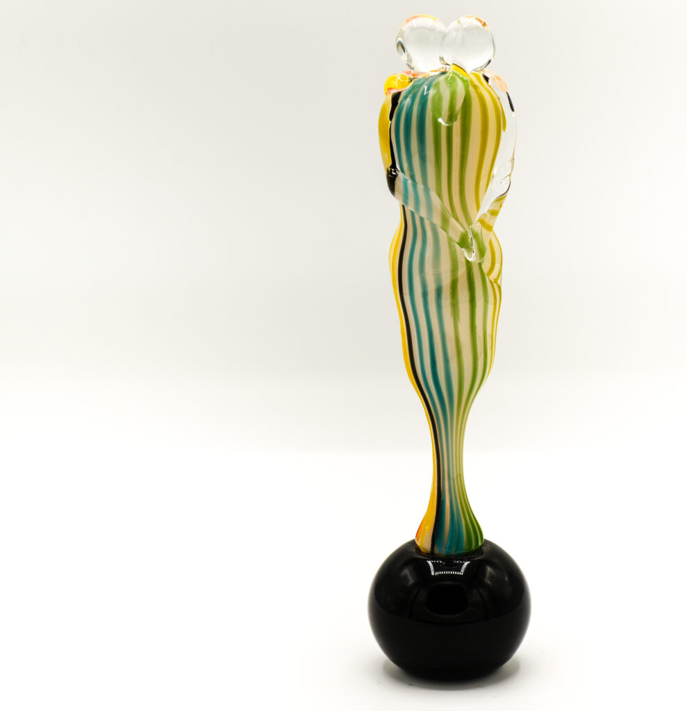 Multicolored lovers made with canes of various colors, both transparent and opaque, resting on a solid black sphere