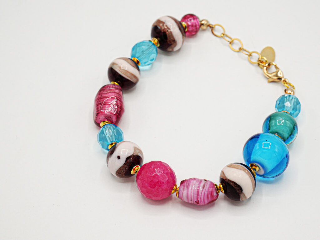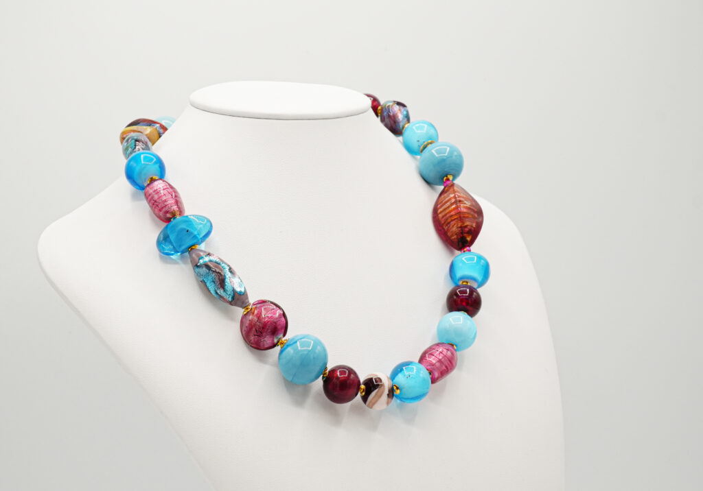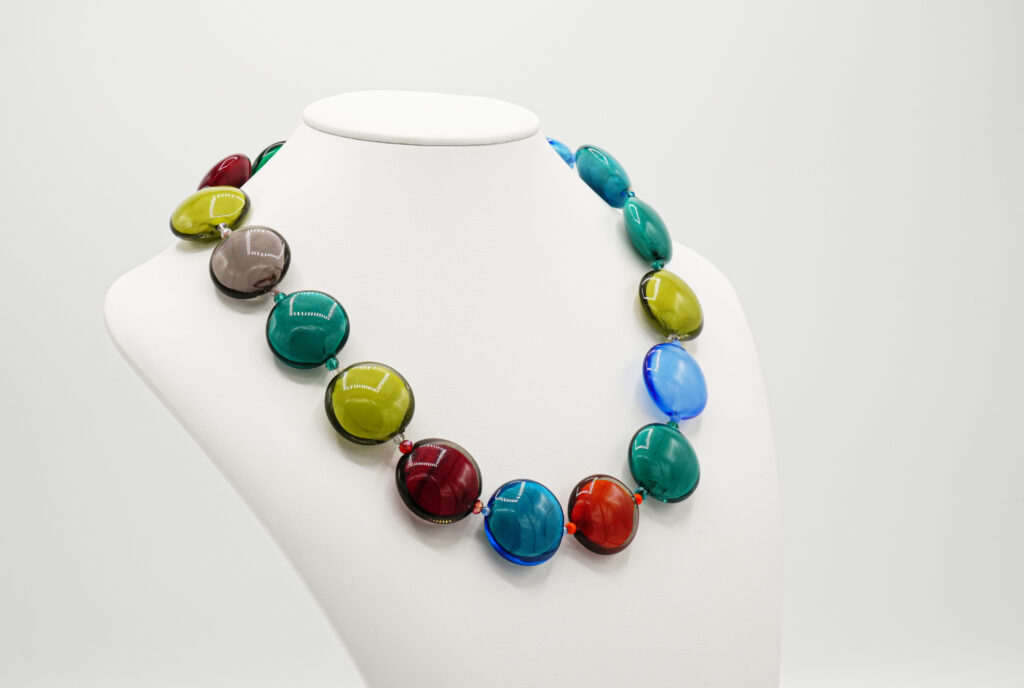 Necklace made with flat shaped pearls of different colours, the inside is opaque in color while the outside of the pearl is covered in transparent crystal colour, all hot and hand worked.