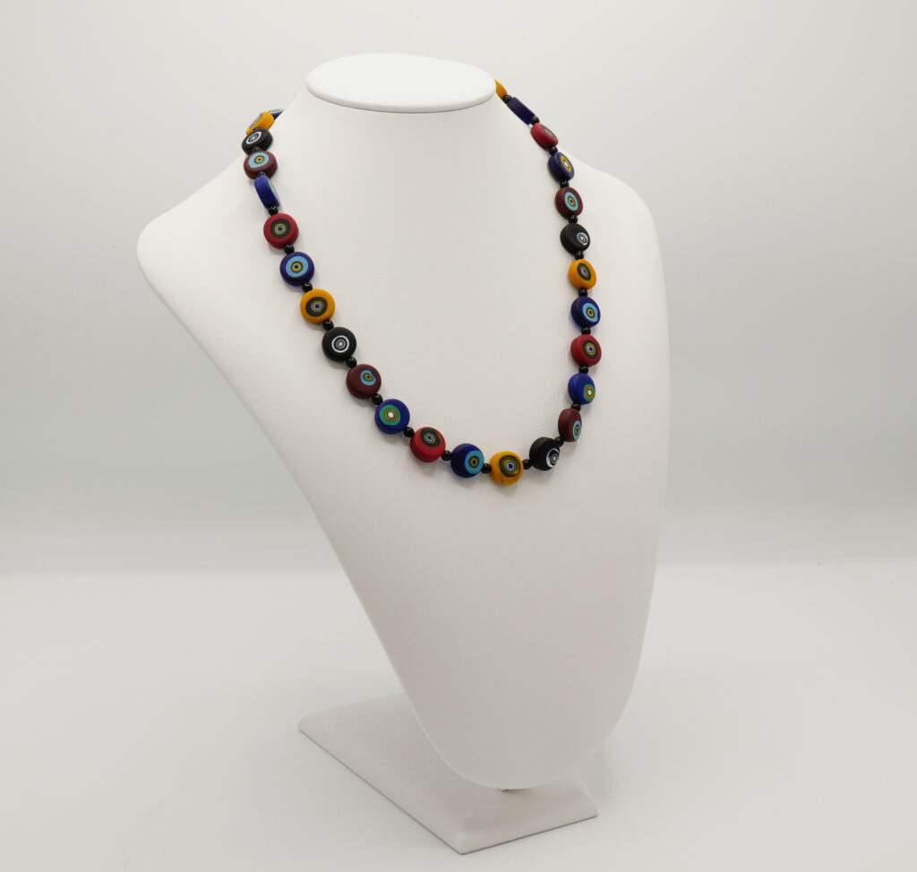Necklace made with flat and round pearls of different colors with a murrina in the centre.