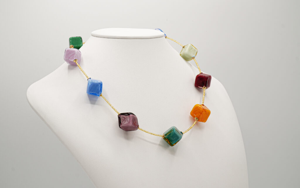 Two-tone necklace made with a blown part and on the opposite side, square pearls of various colors in paste.