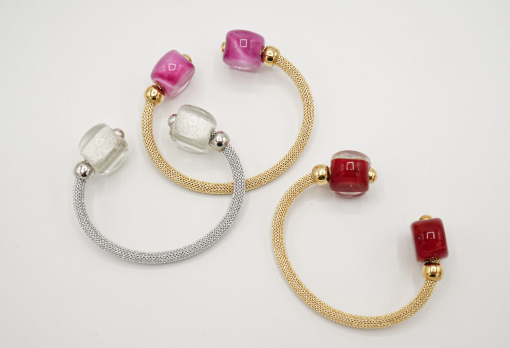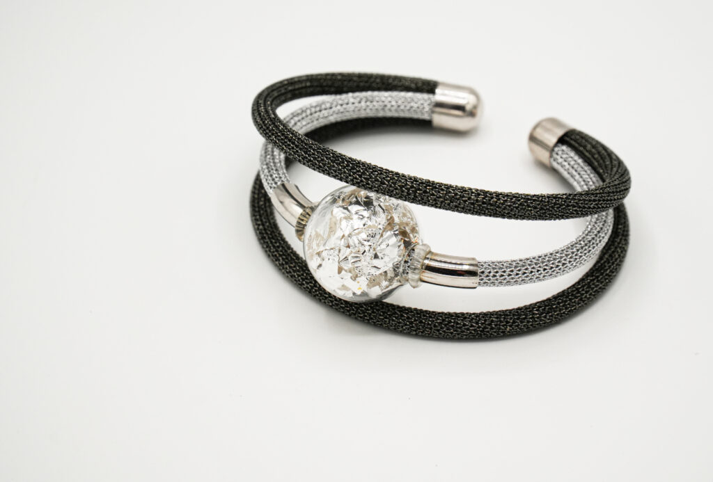 Spectacular bracelet made of Kevlar and with a glass pearl inside which a 24-karat gold leaf and a silver leaf have been inserted.