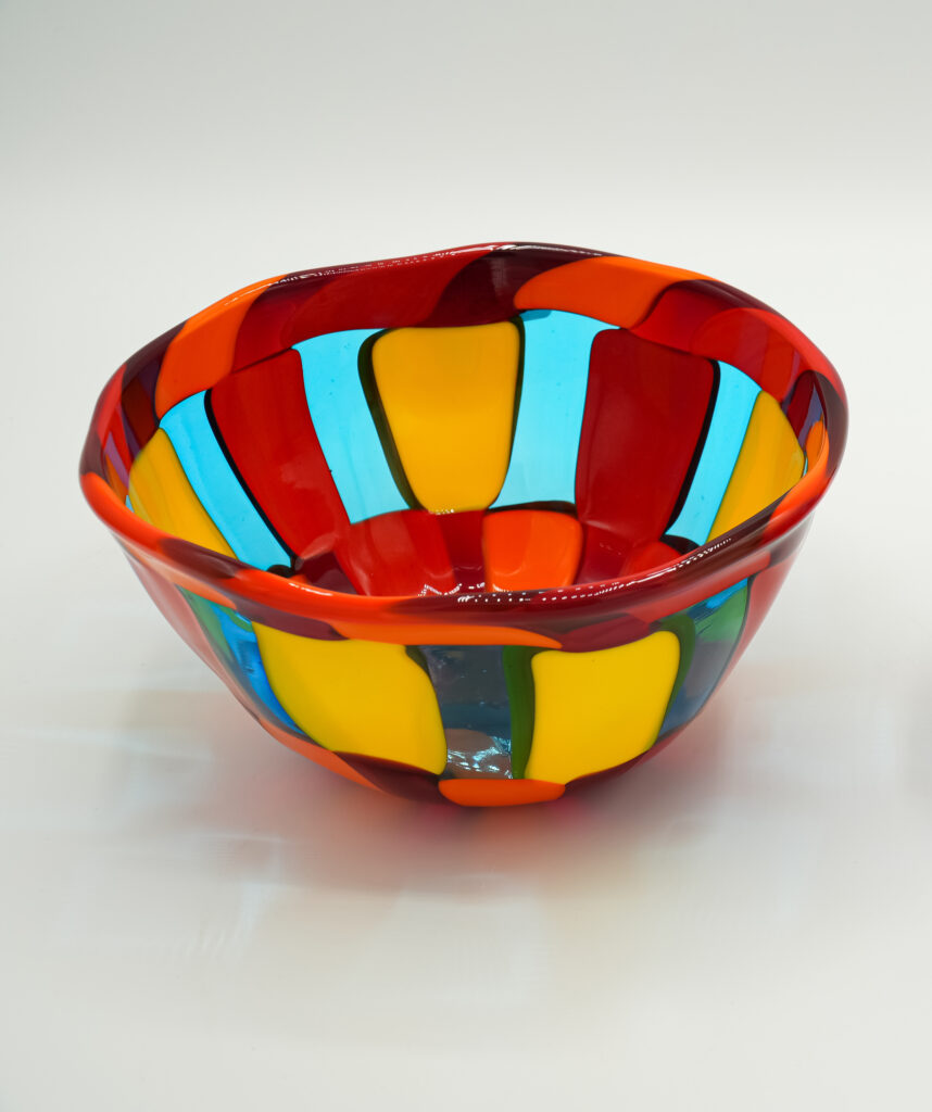 Cup made with lampwork technique composed of opaque coloured tiles and transparent inserts