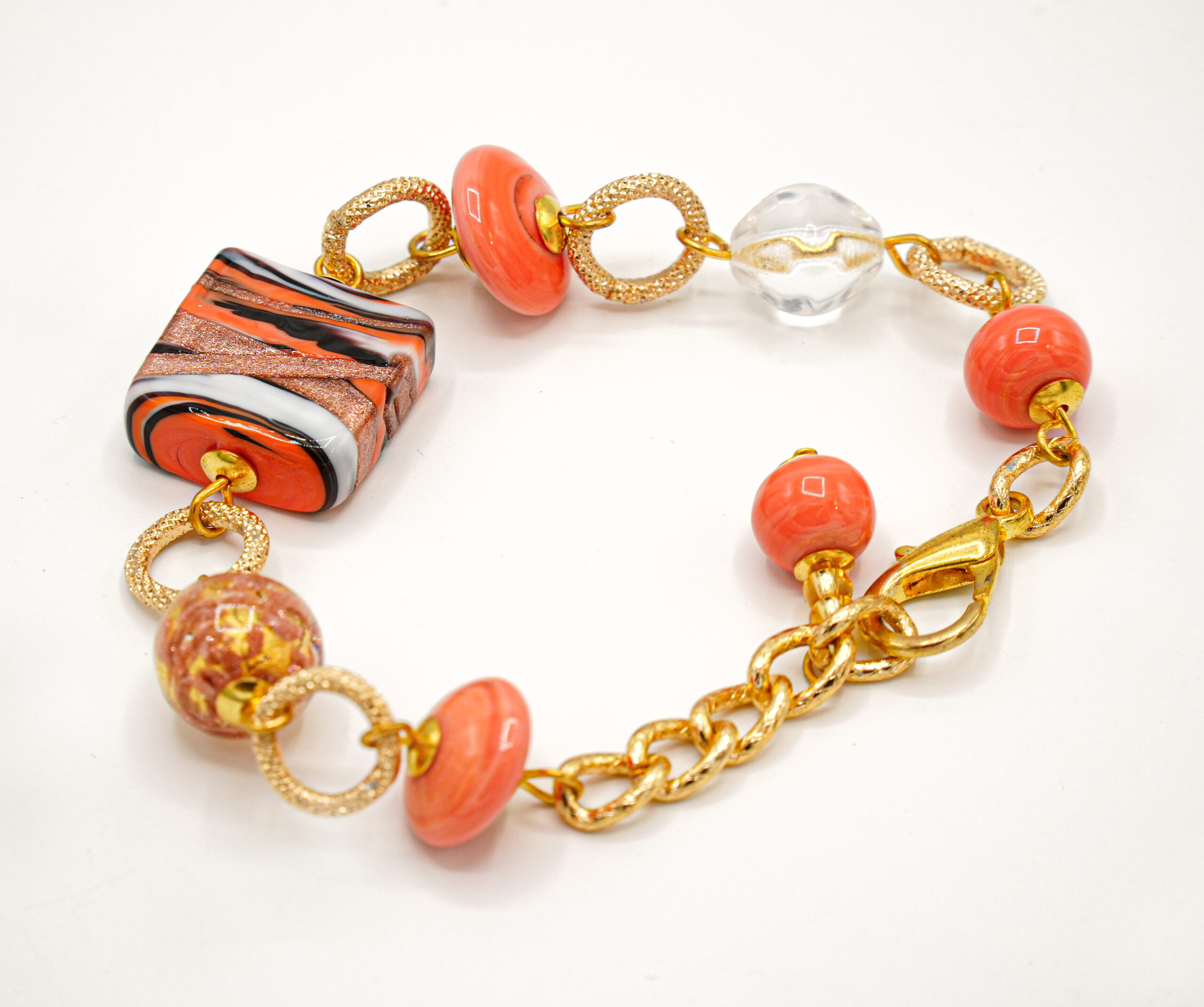 Bracelet with white and orange flat pearl and aventurine threads, all hot worked.