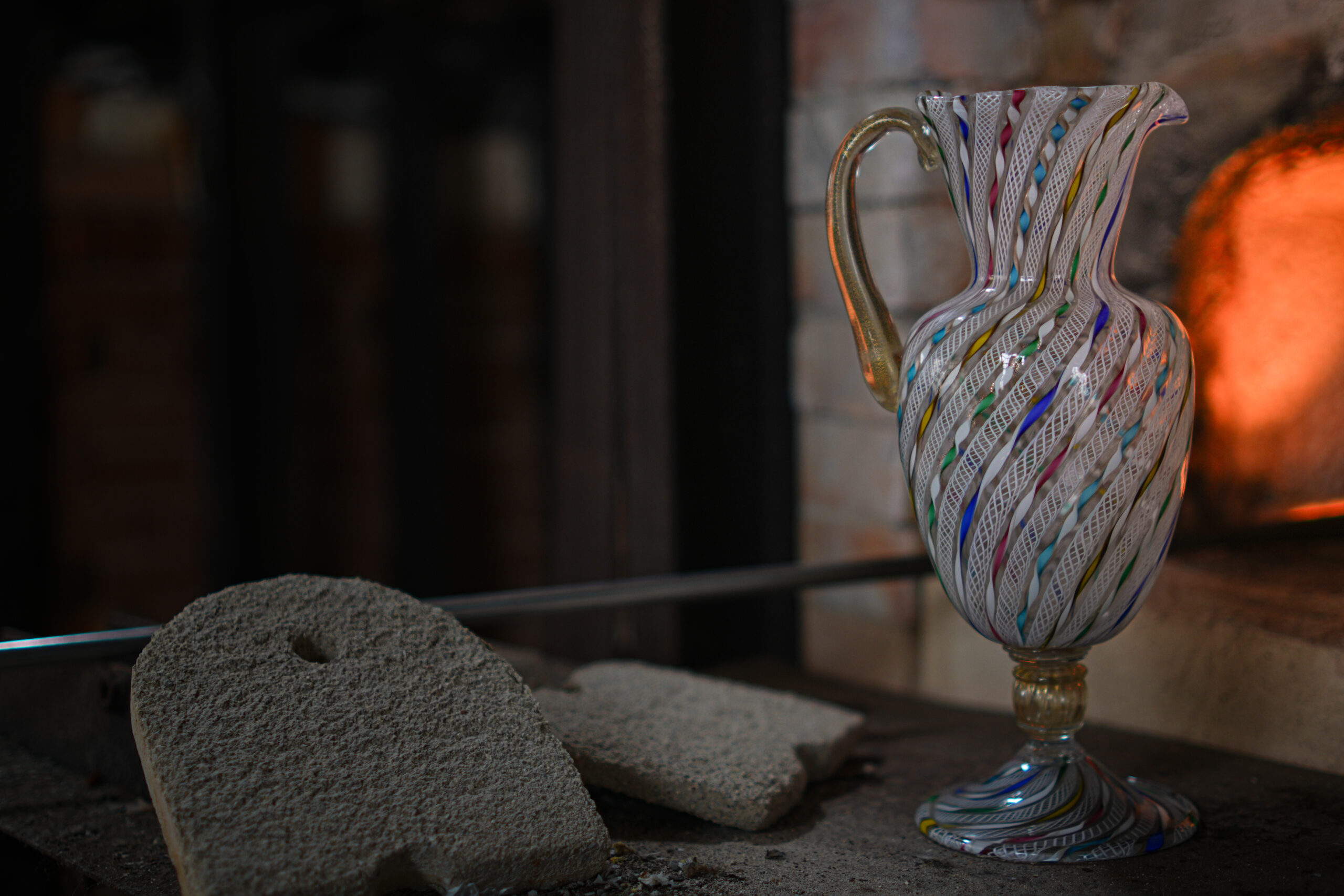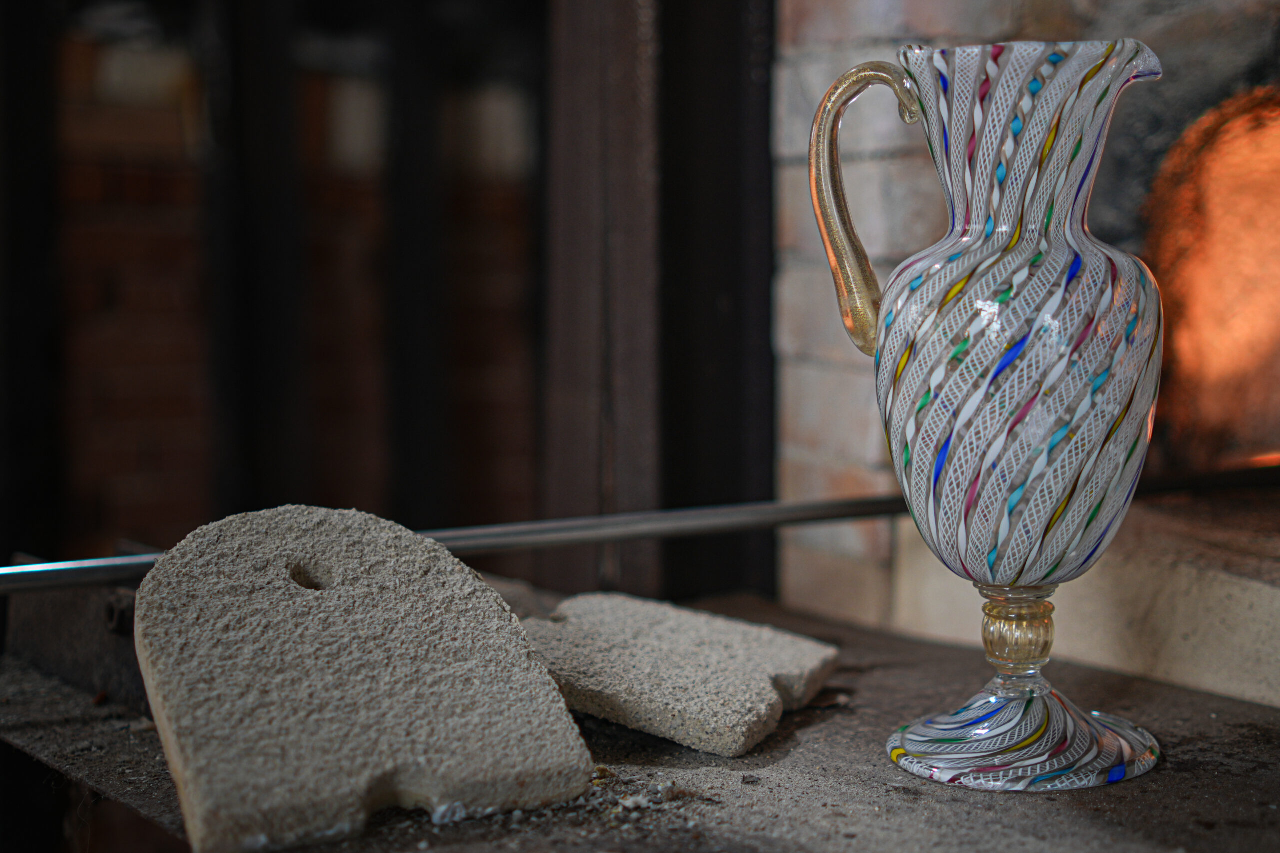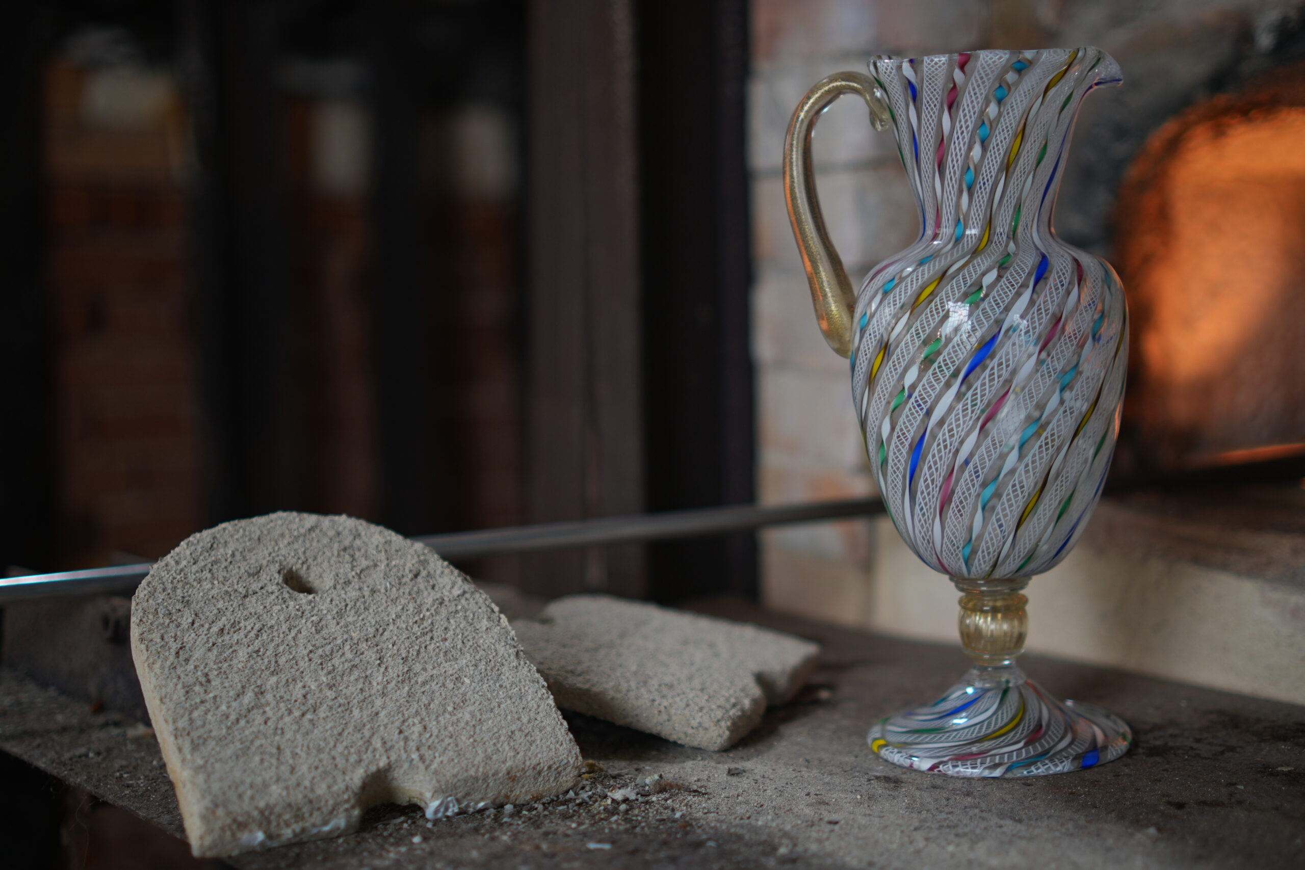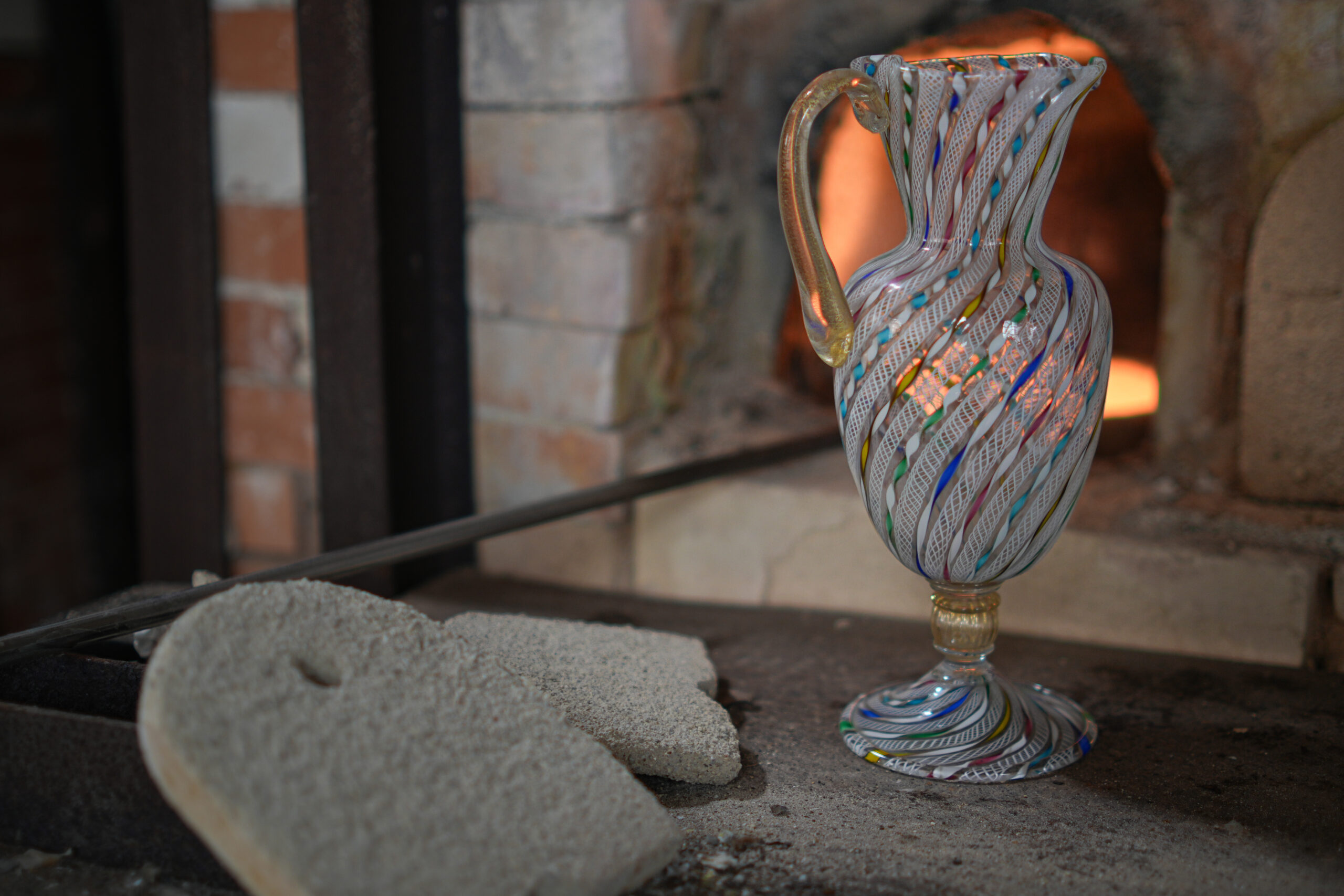 Spectacular carafe, made with white filigree canes and multicolored zanfirico. On the upper part, a handle hot-attached in 24-karat gold makes its appearance. Unique piece.