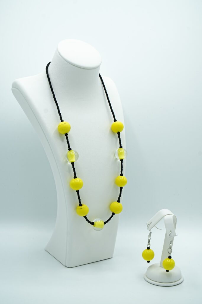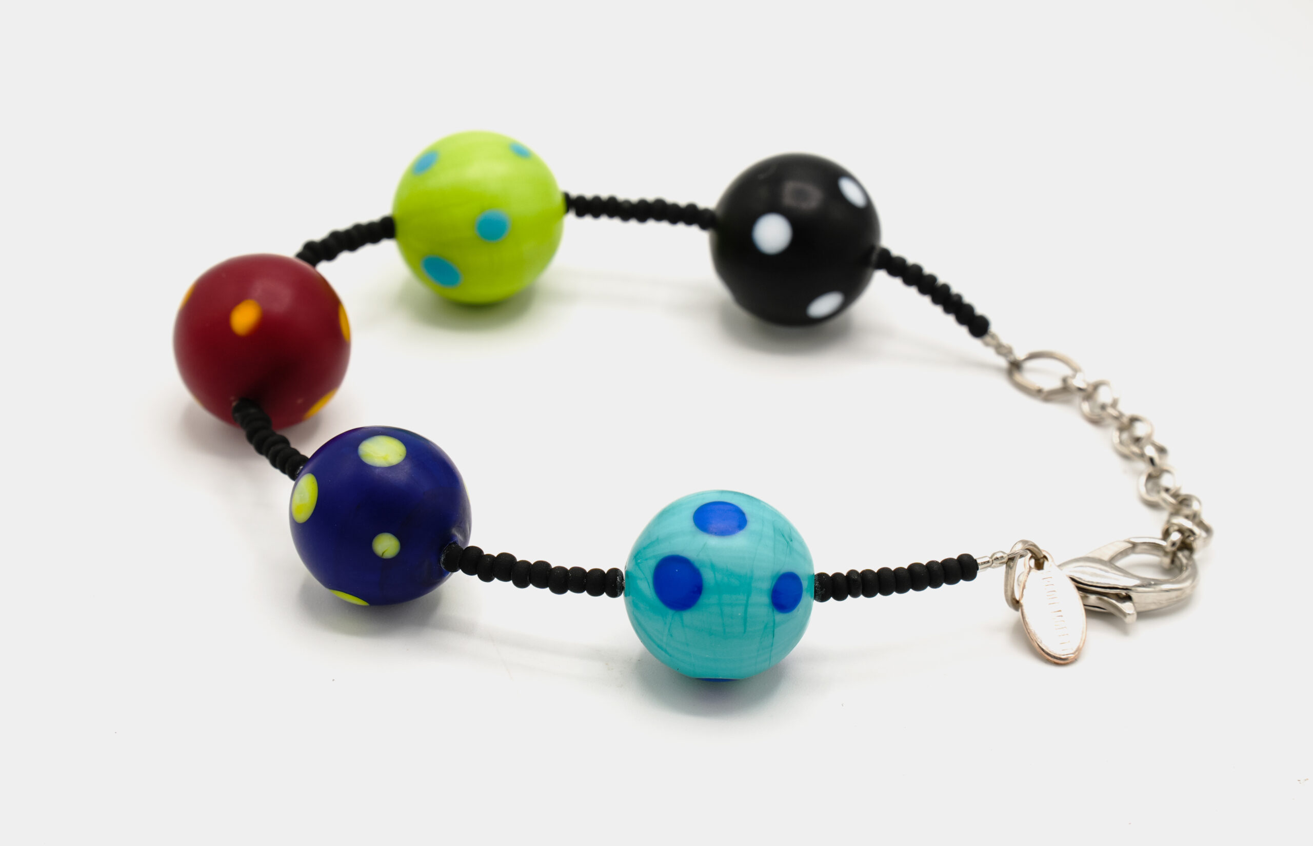 Necklace with black beads and round opaque pearls of various shades with hot-applied color dots.
