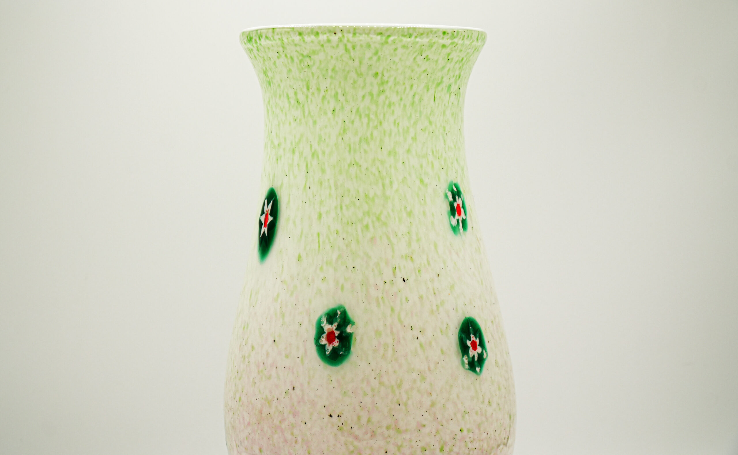 Collectible vase from the 80s, made with shaded powders of different colors and green flower-shaped murrine with a red central point.