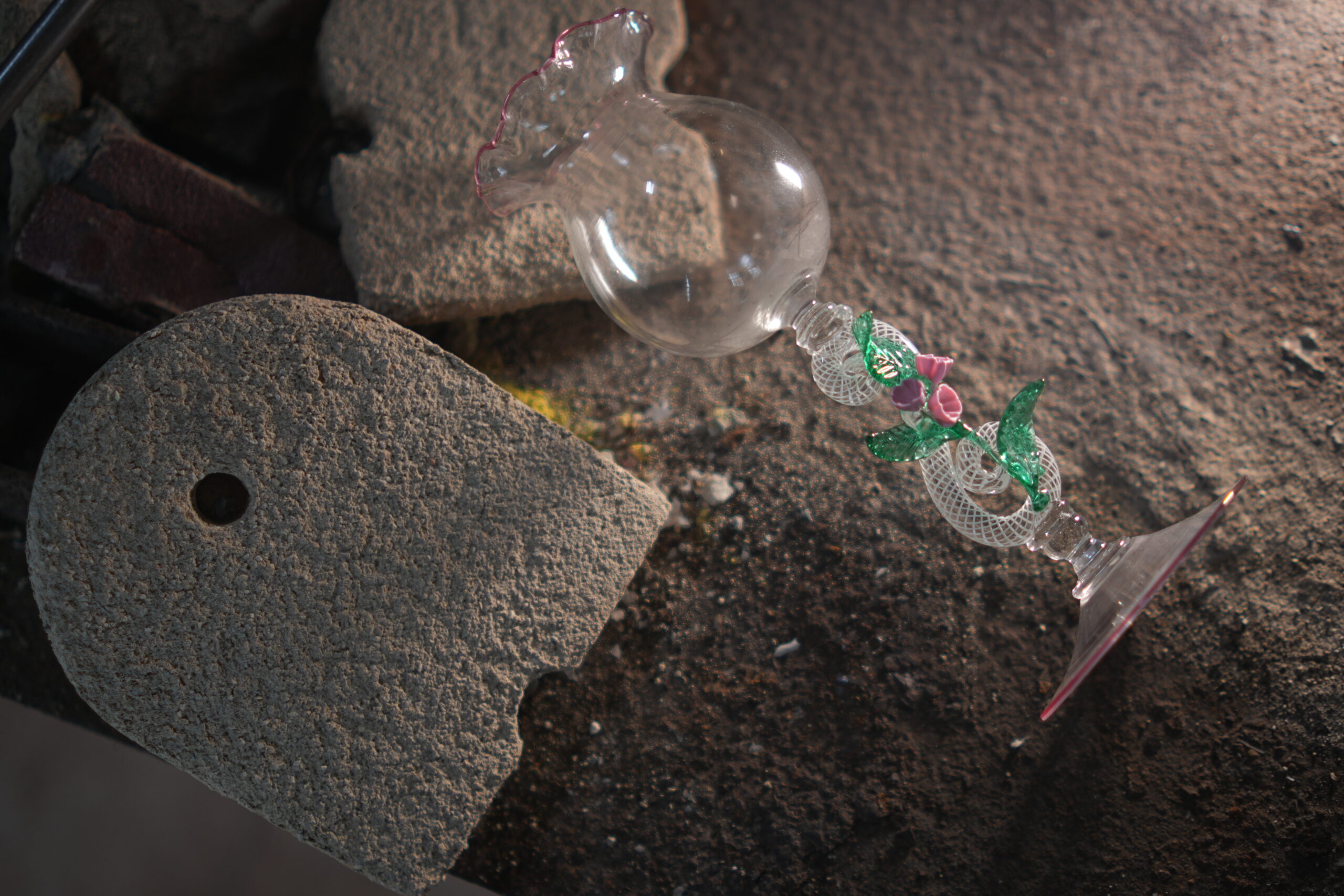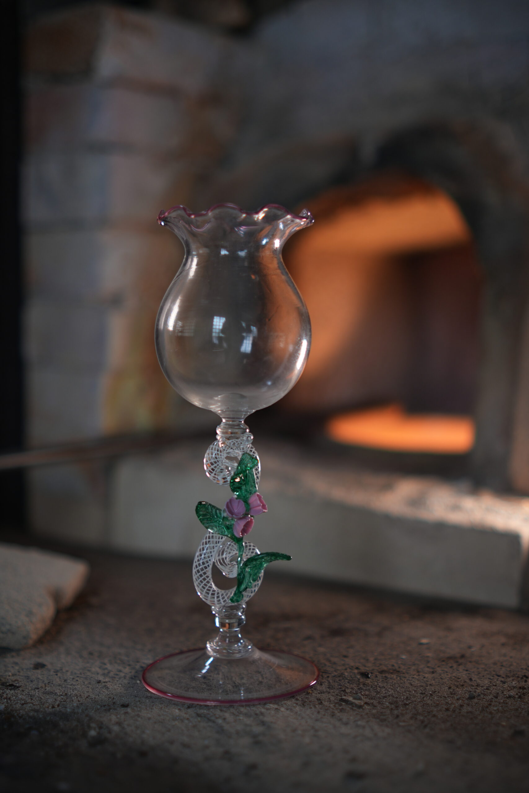 Wonderful and elegant glass with smooth bowl and ruby ​​rim, in the center we have a figure eight workmanship with fiigrana cane paste flowers and transparent leaves applied hot.
