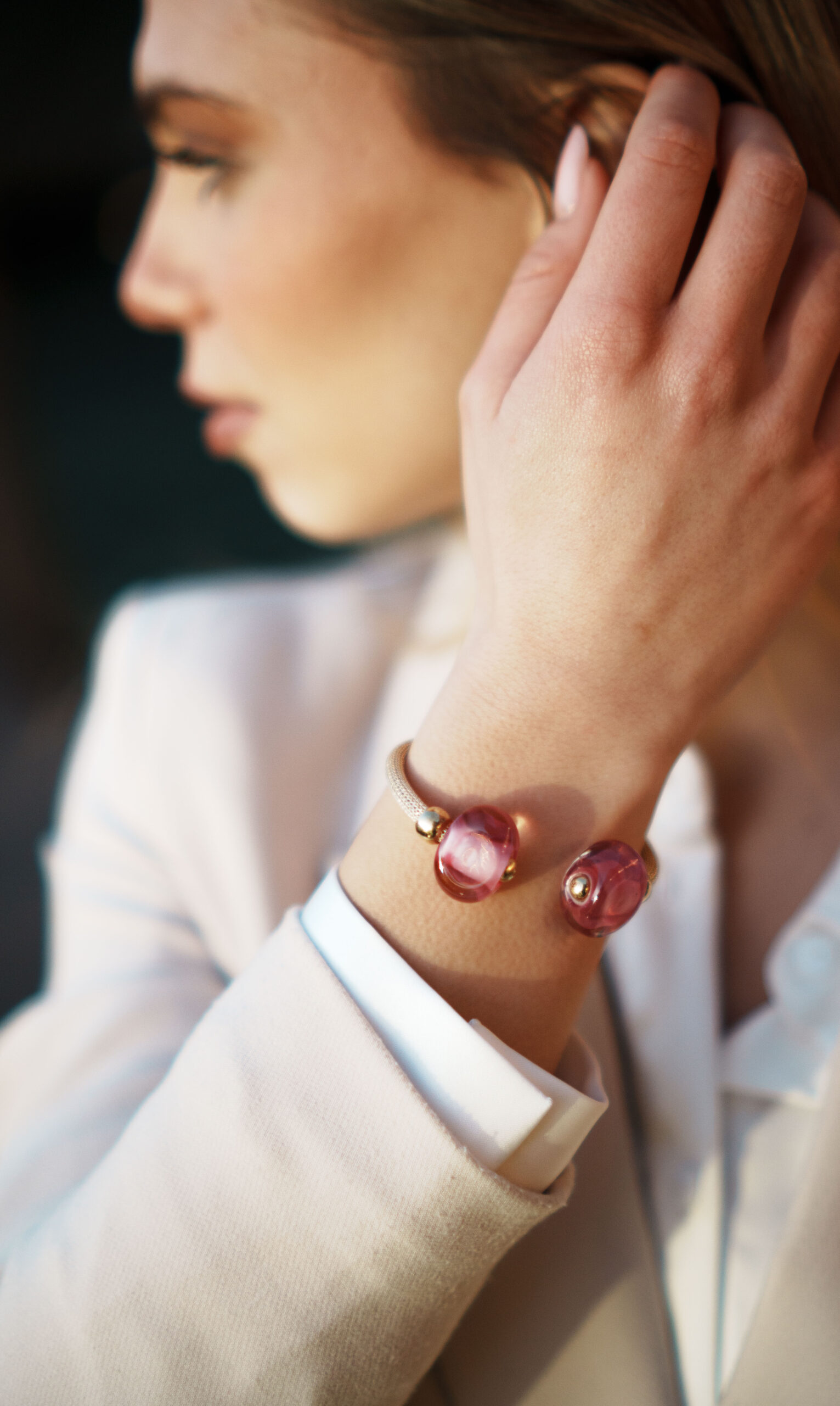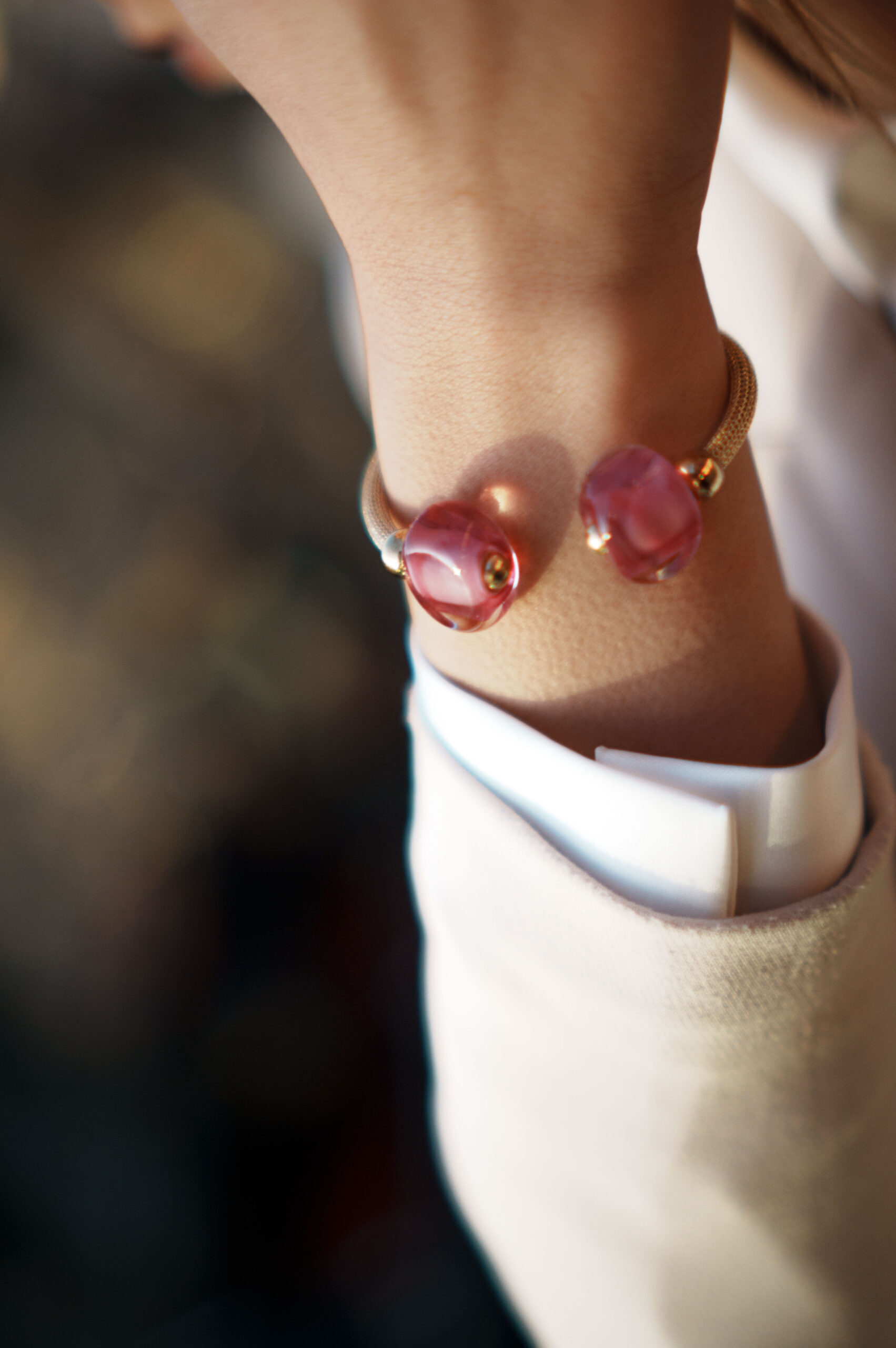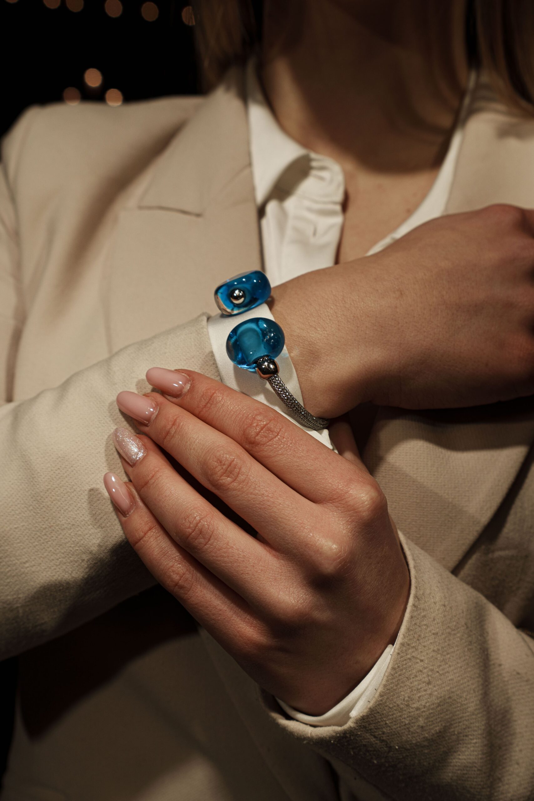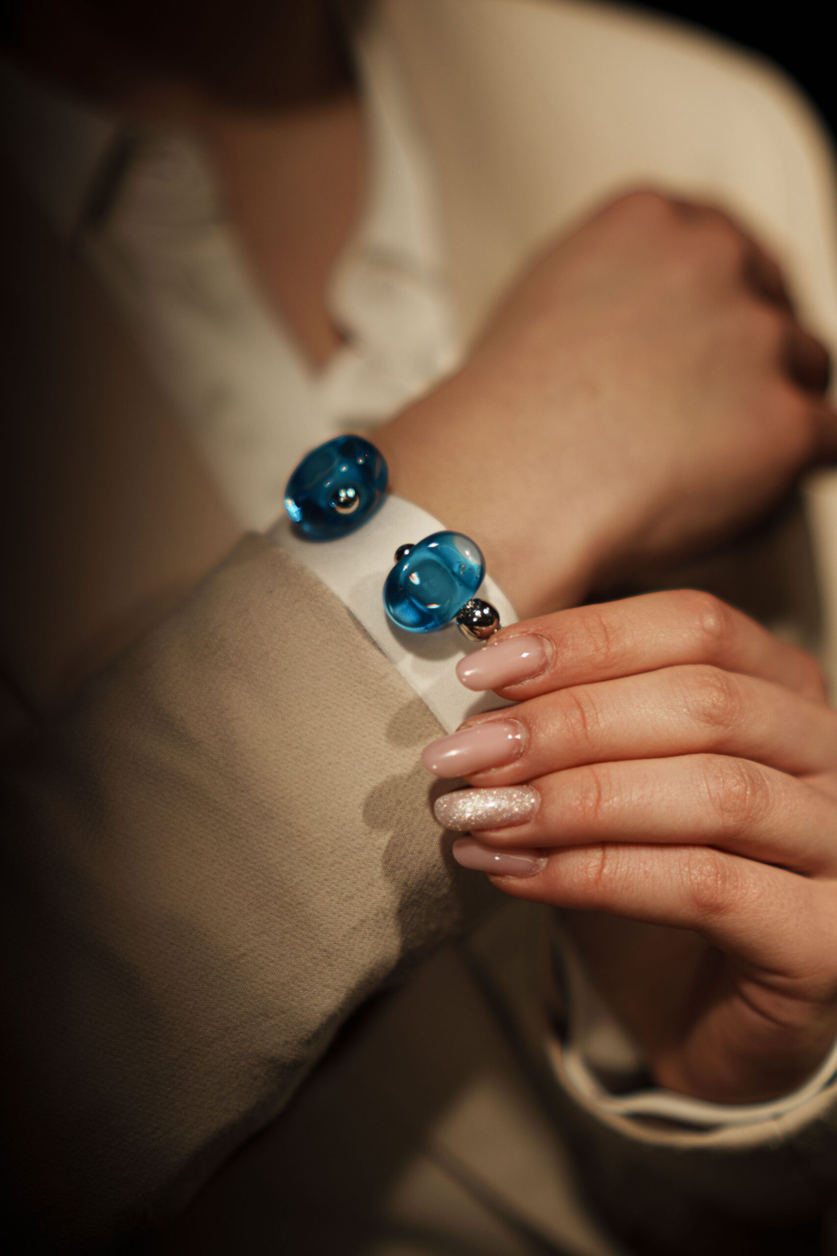 Modern bracelet made with kevlar material and opaque colored pearls with crystal covering