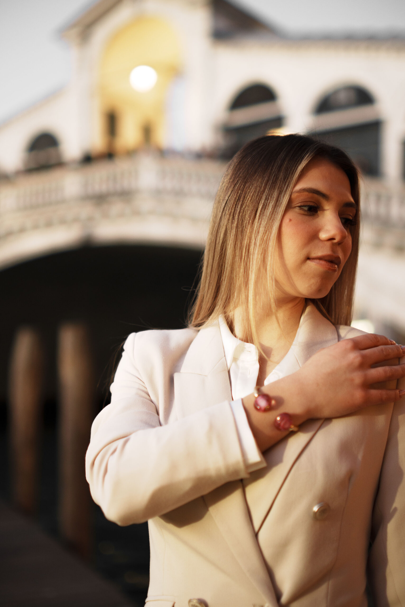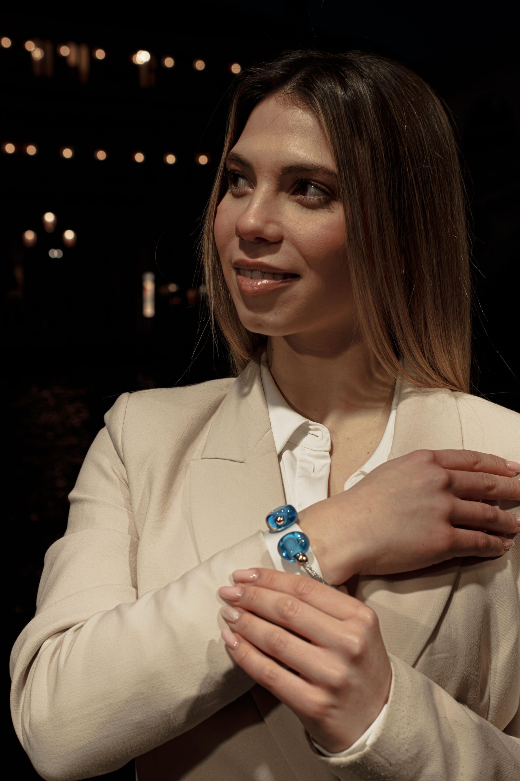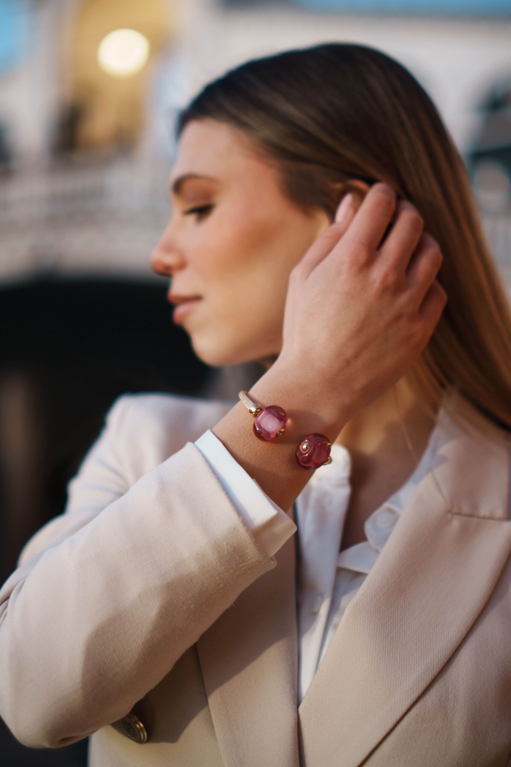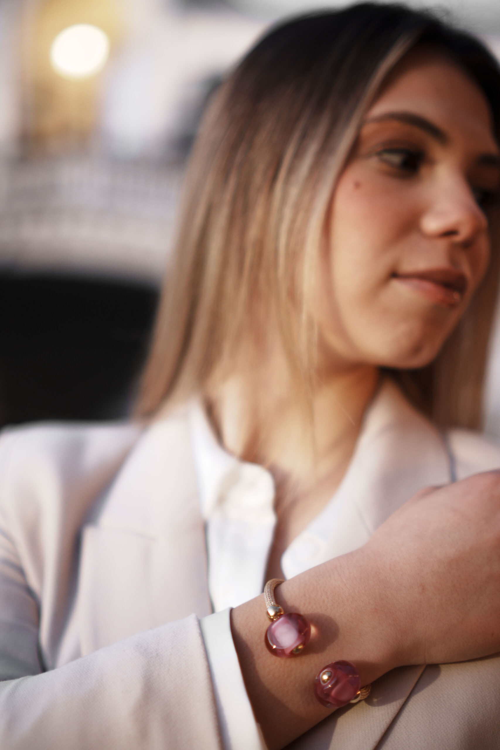 Modern bracelet made with kevlar material and opaque colored pearls with crystal covering