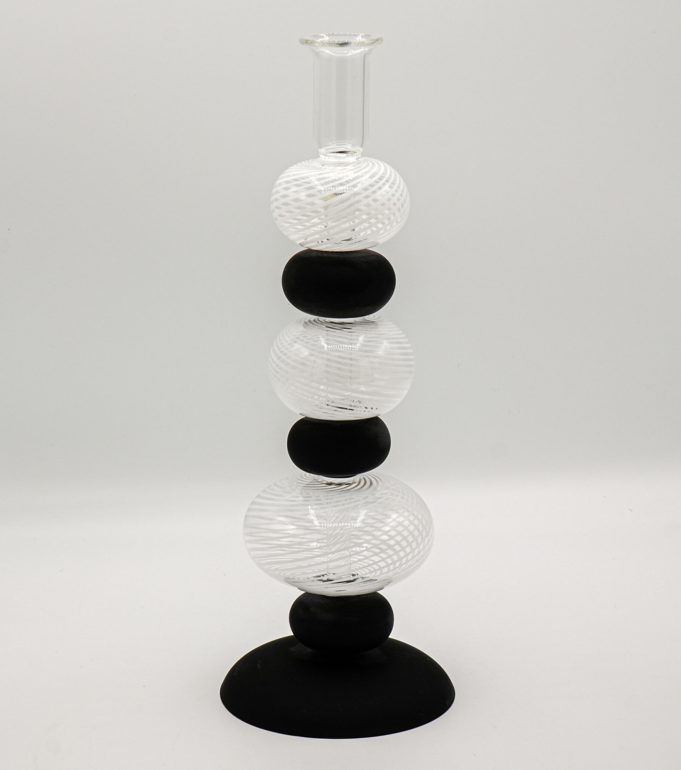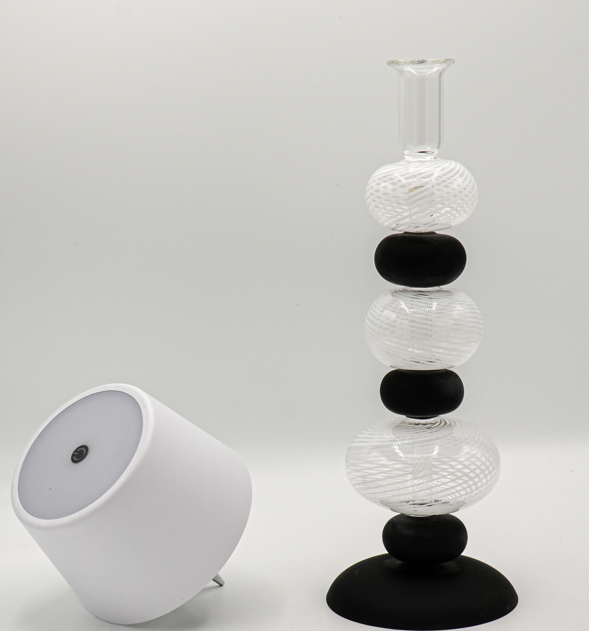 Modern lamp that can also become a candlestick made of flattened filigree balls and satin black balls