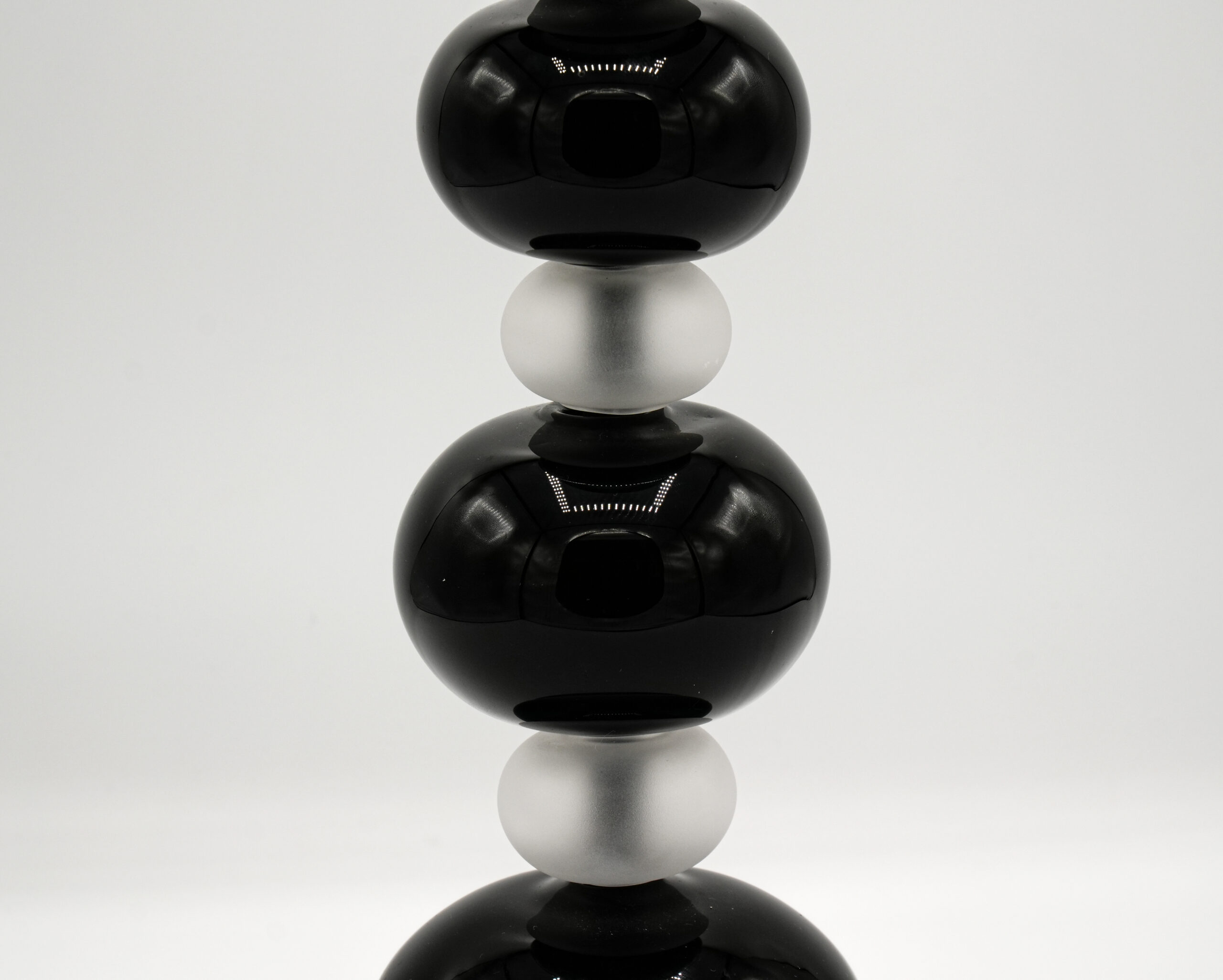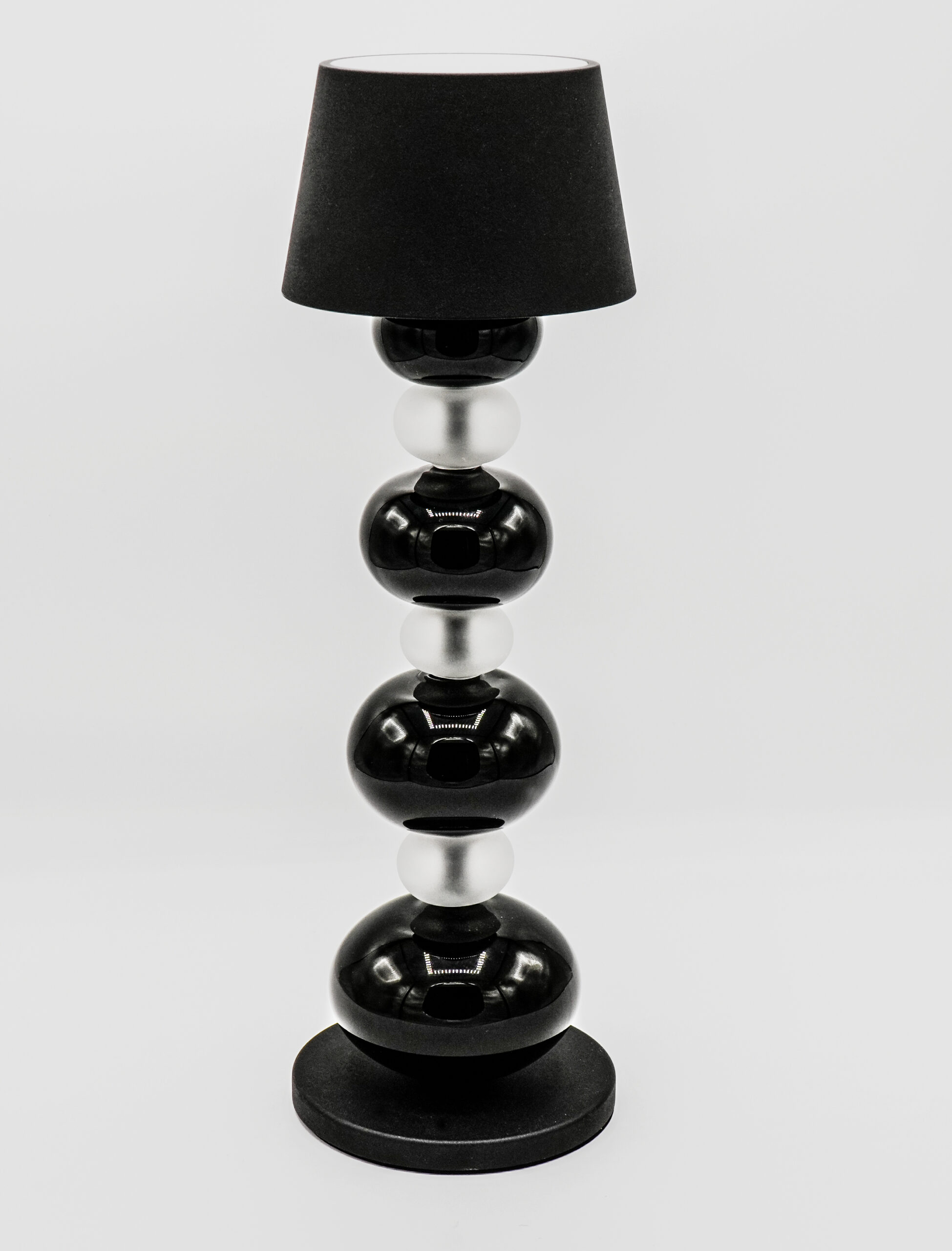 Modern style lamp with balls of various sizes in black and satin grey with lampshade.
