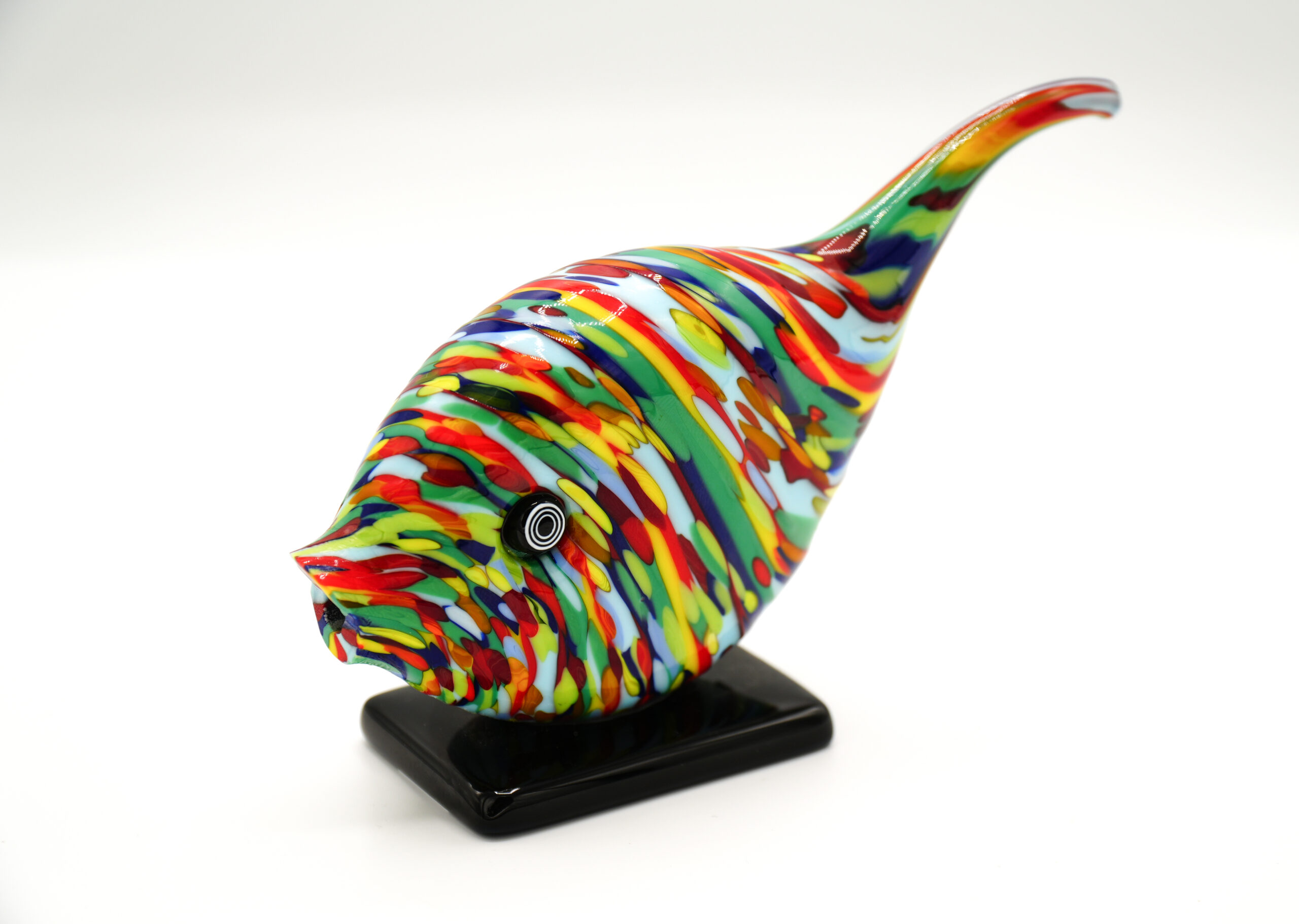 Multicolored fish worked with colored glass spots of different colors and then mixed hot.