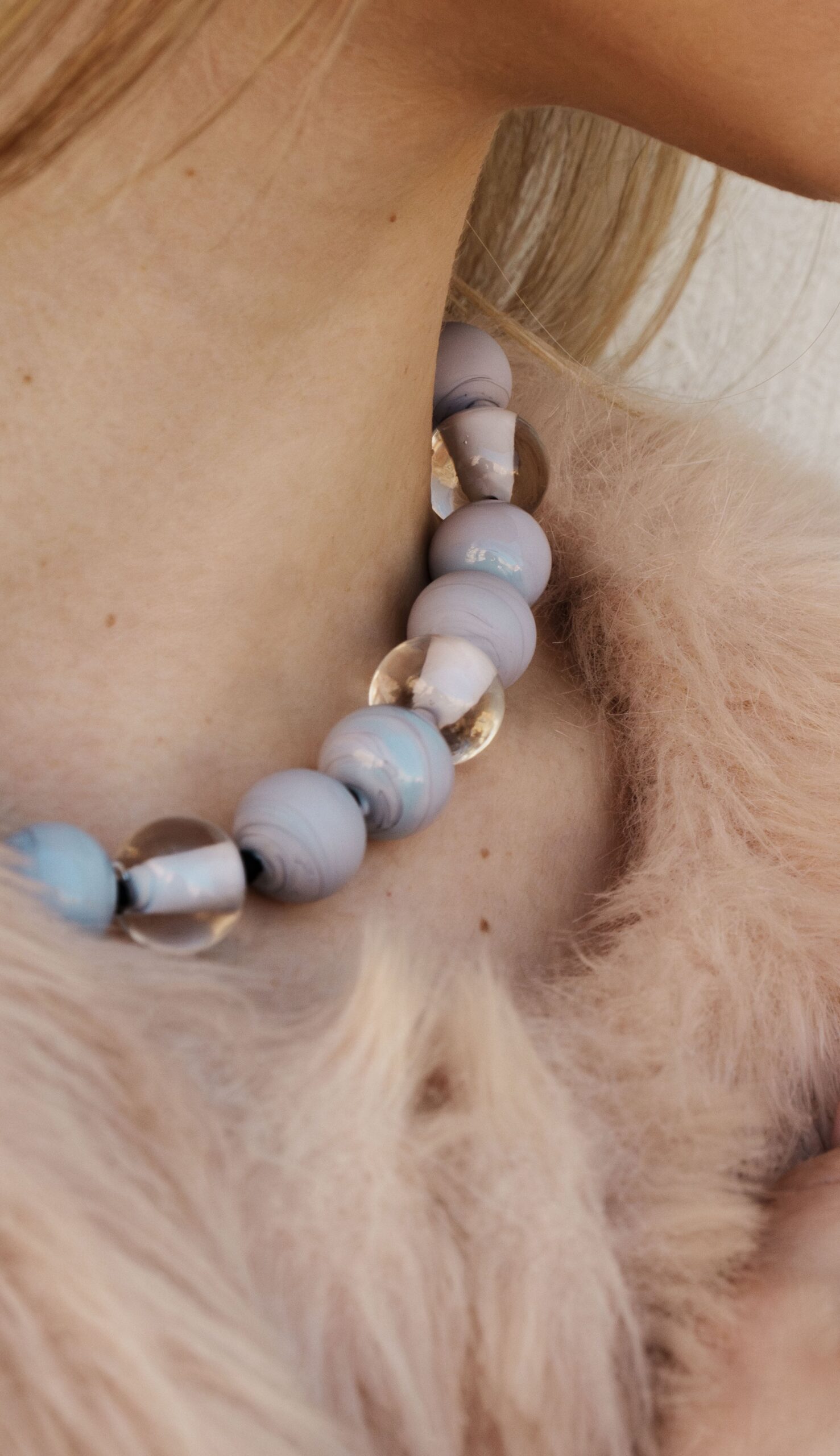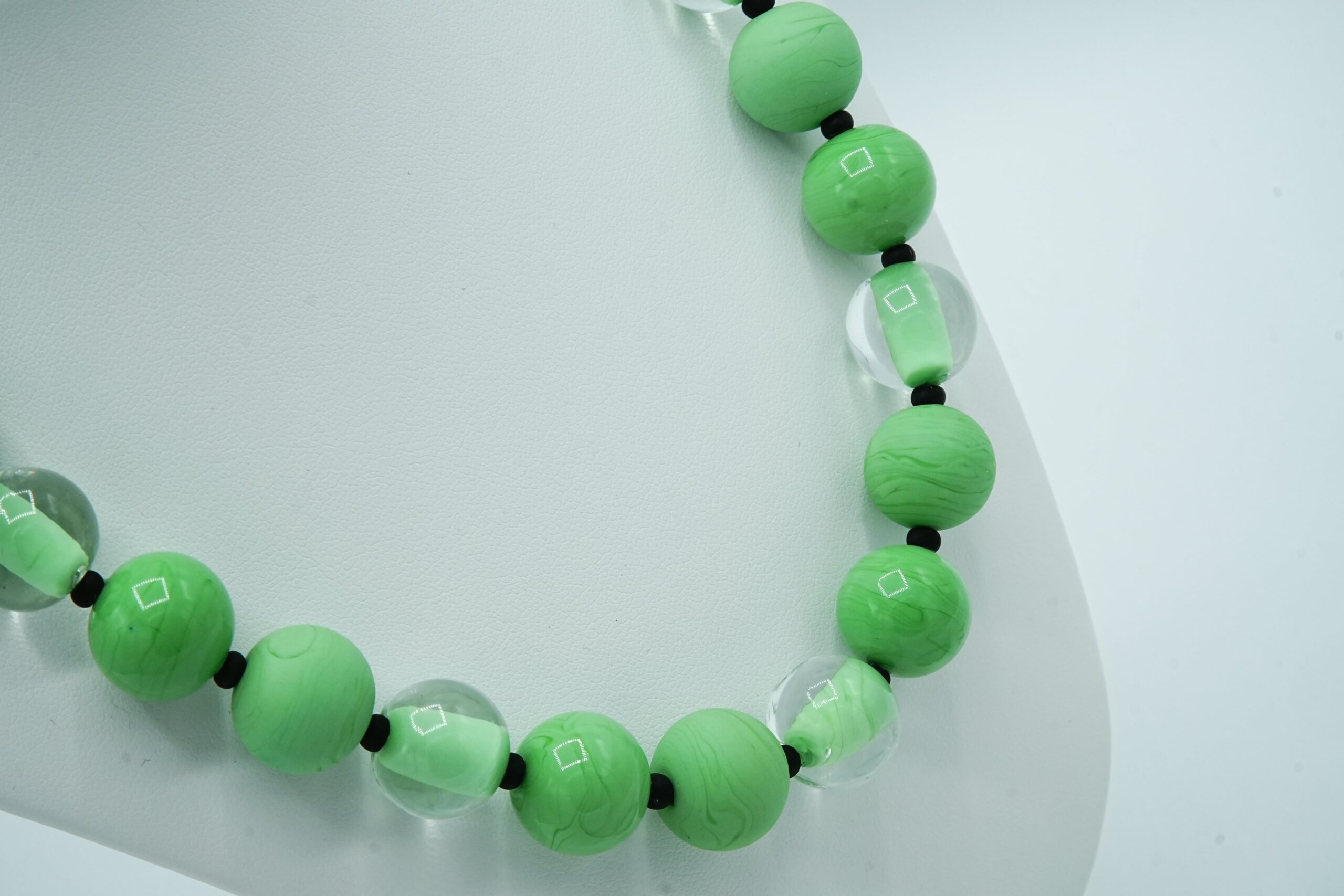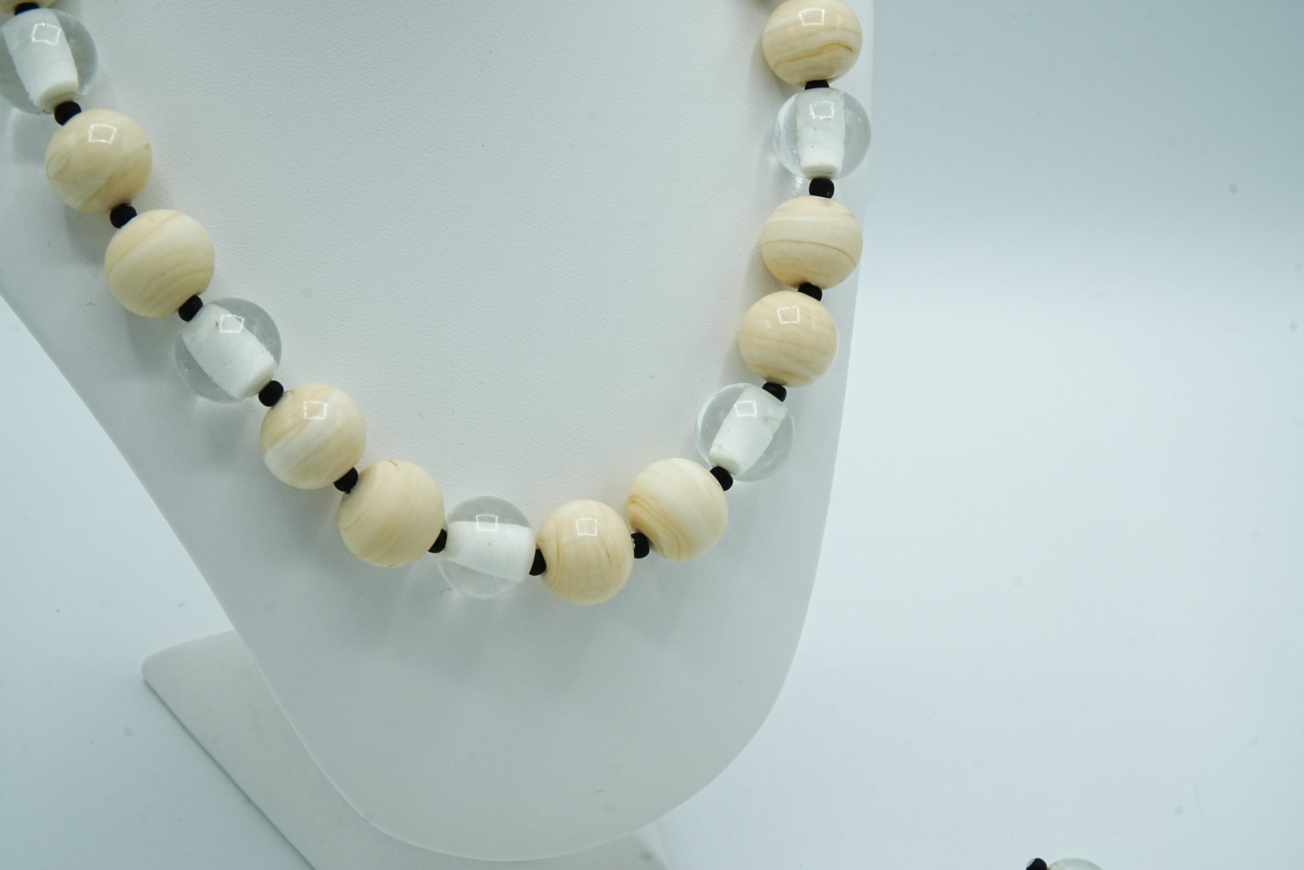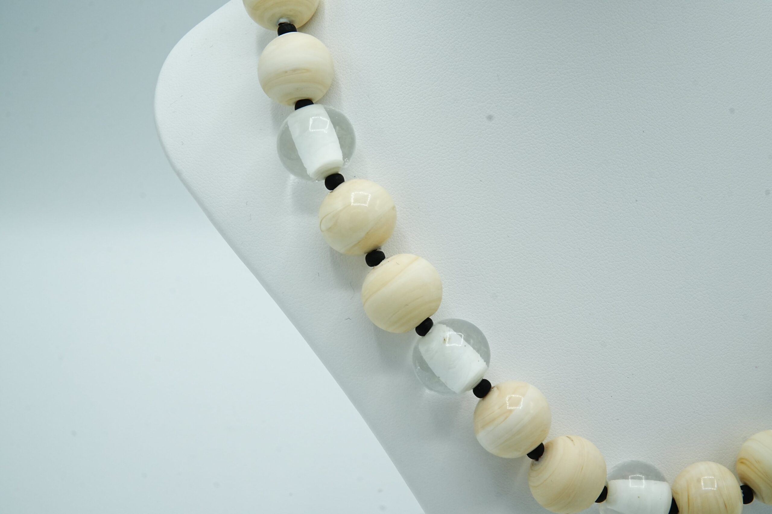 Necklace made with opaque and sandblasted round pearls interspersed with crystal pearls with an opaque core like pearls.
