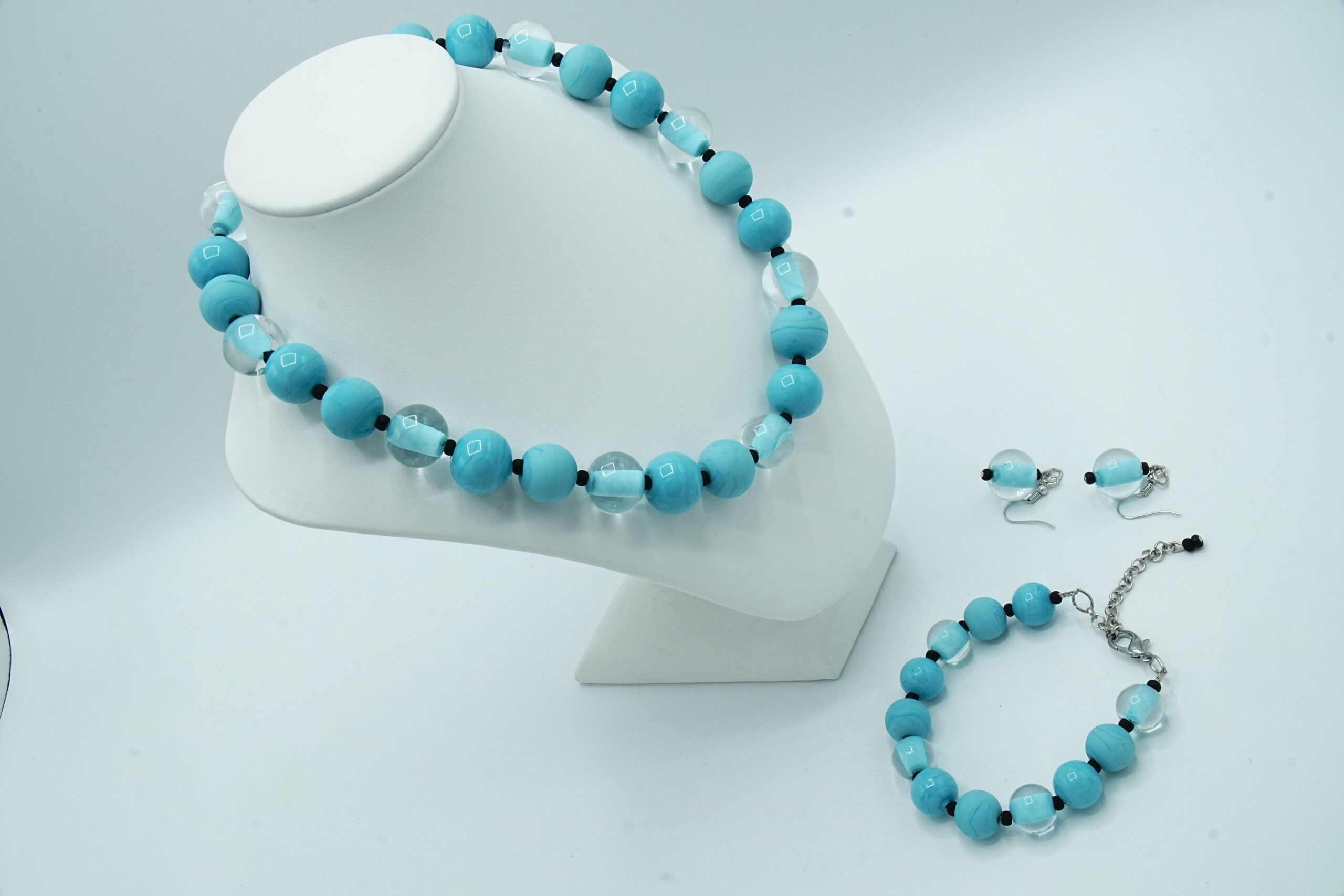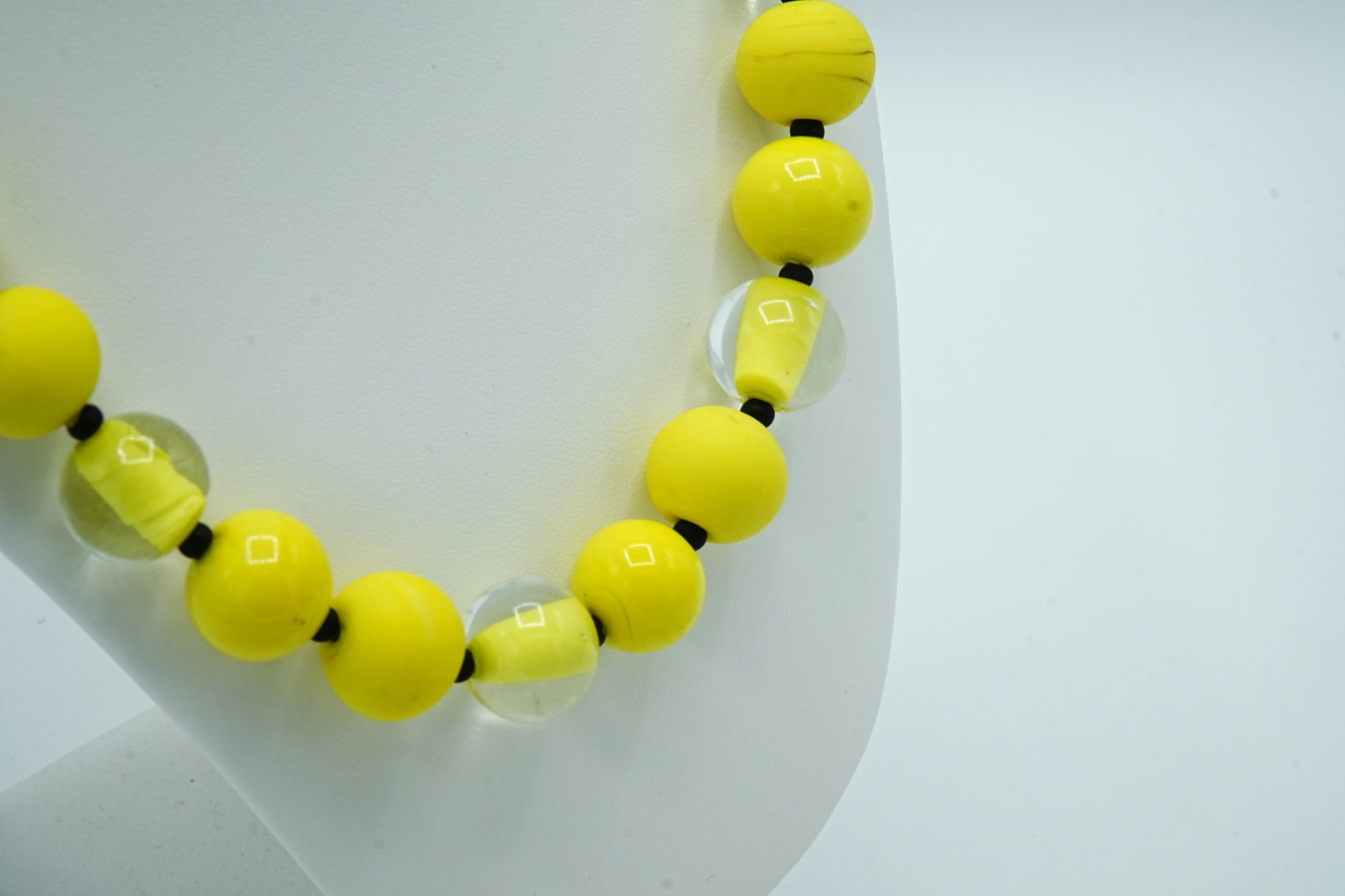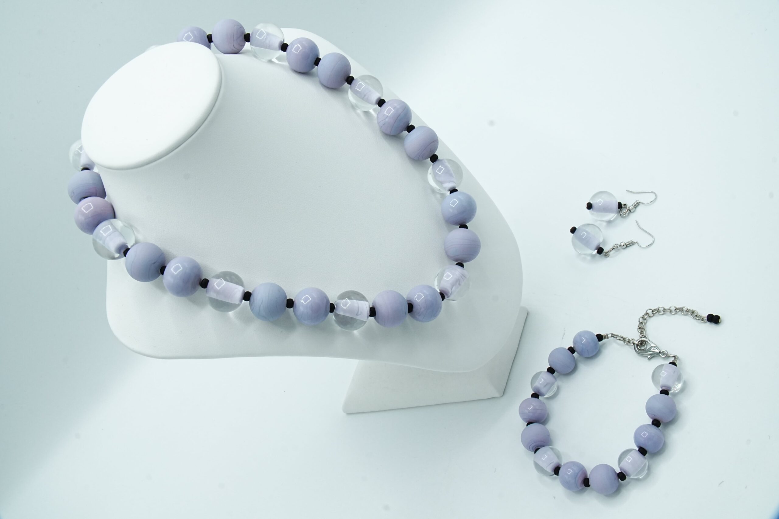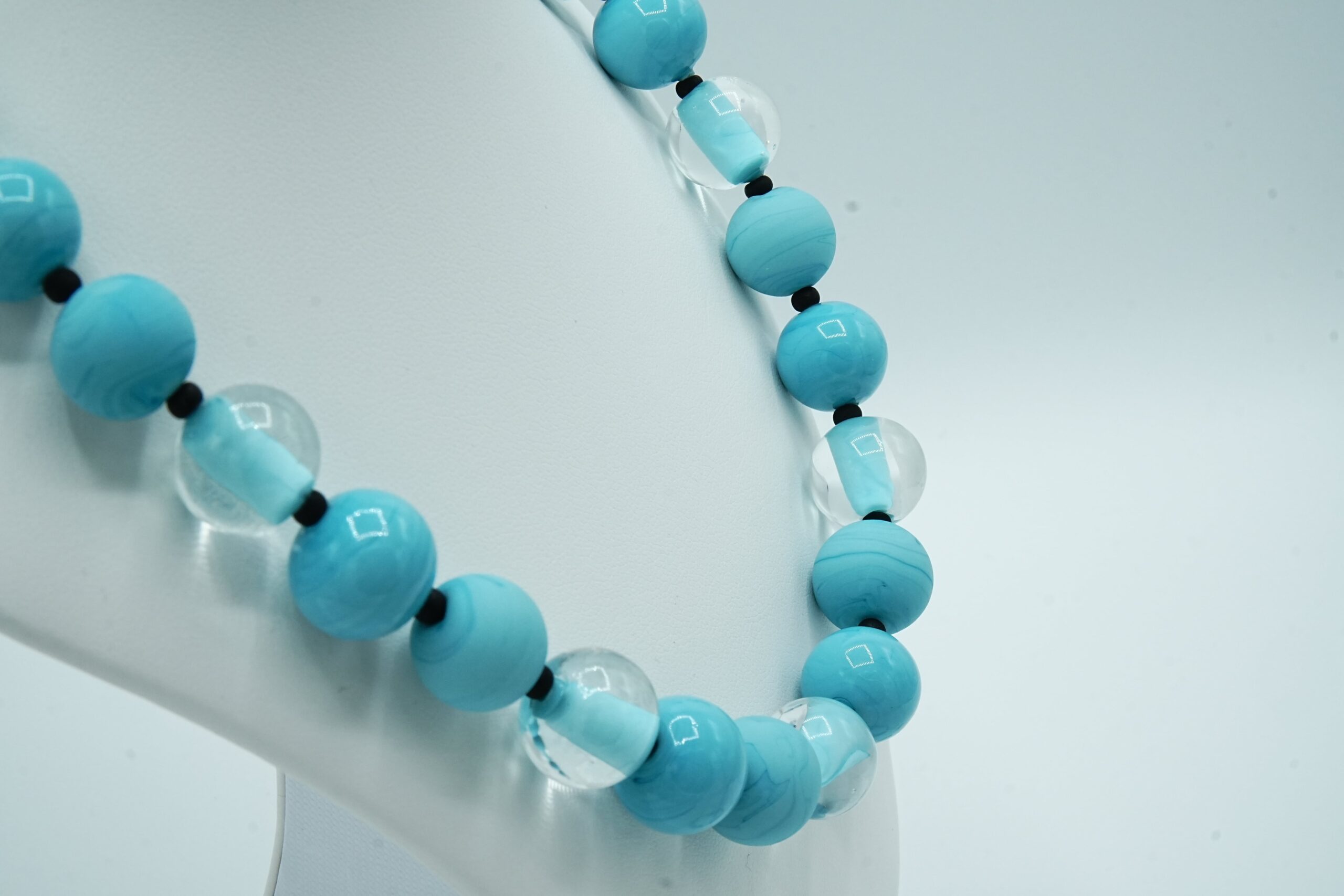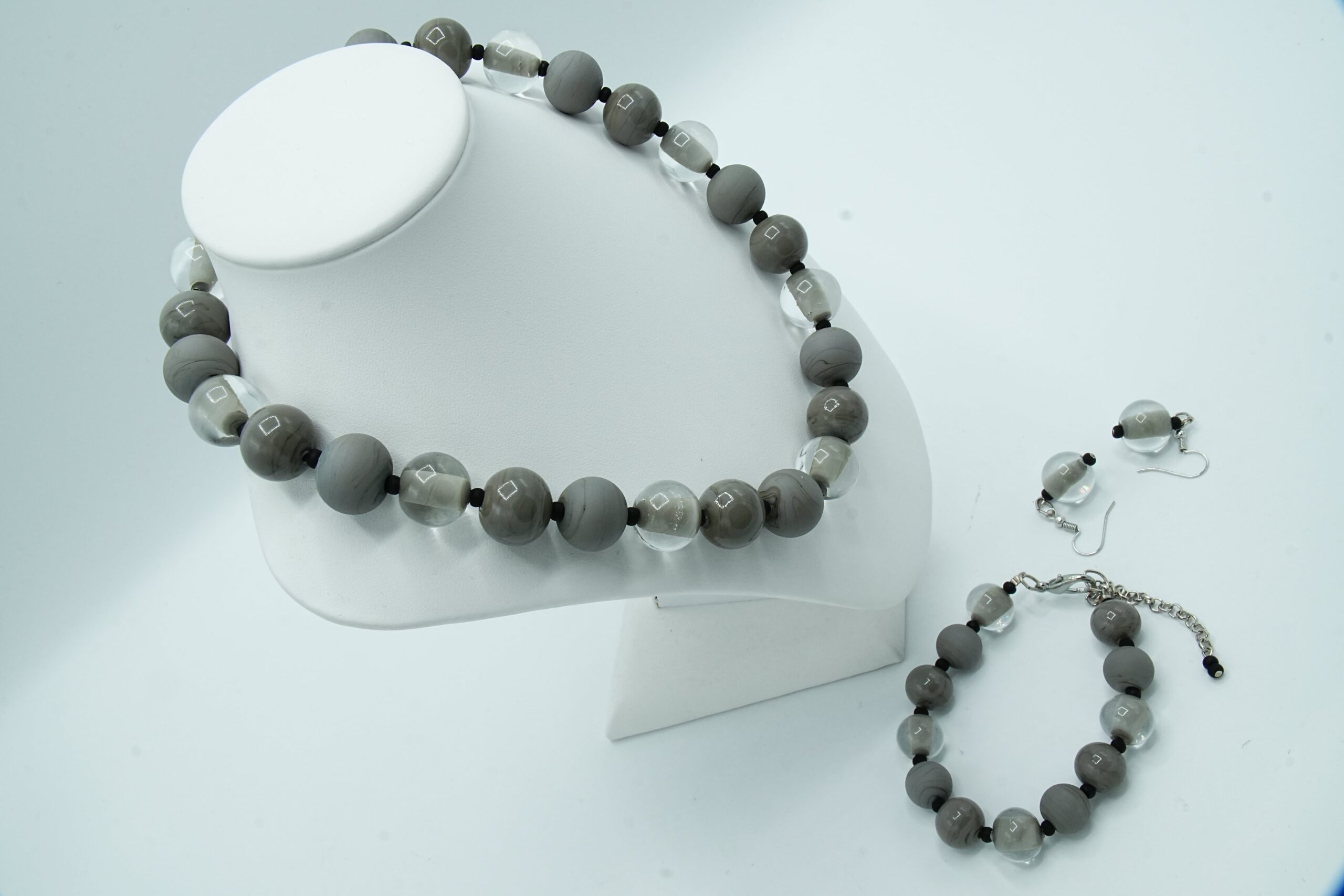 Necklace made with opaque and sandblasted round pearls interspersed with crystal pearls with an opaque core like pearls.