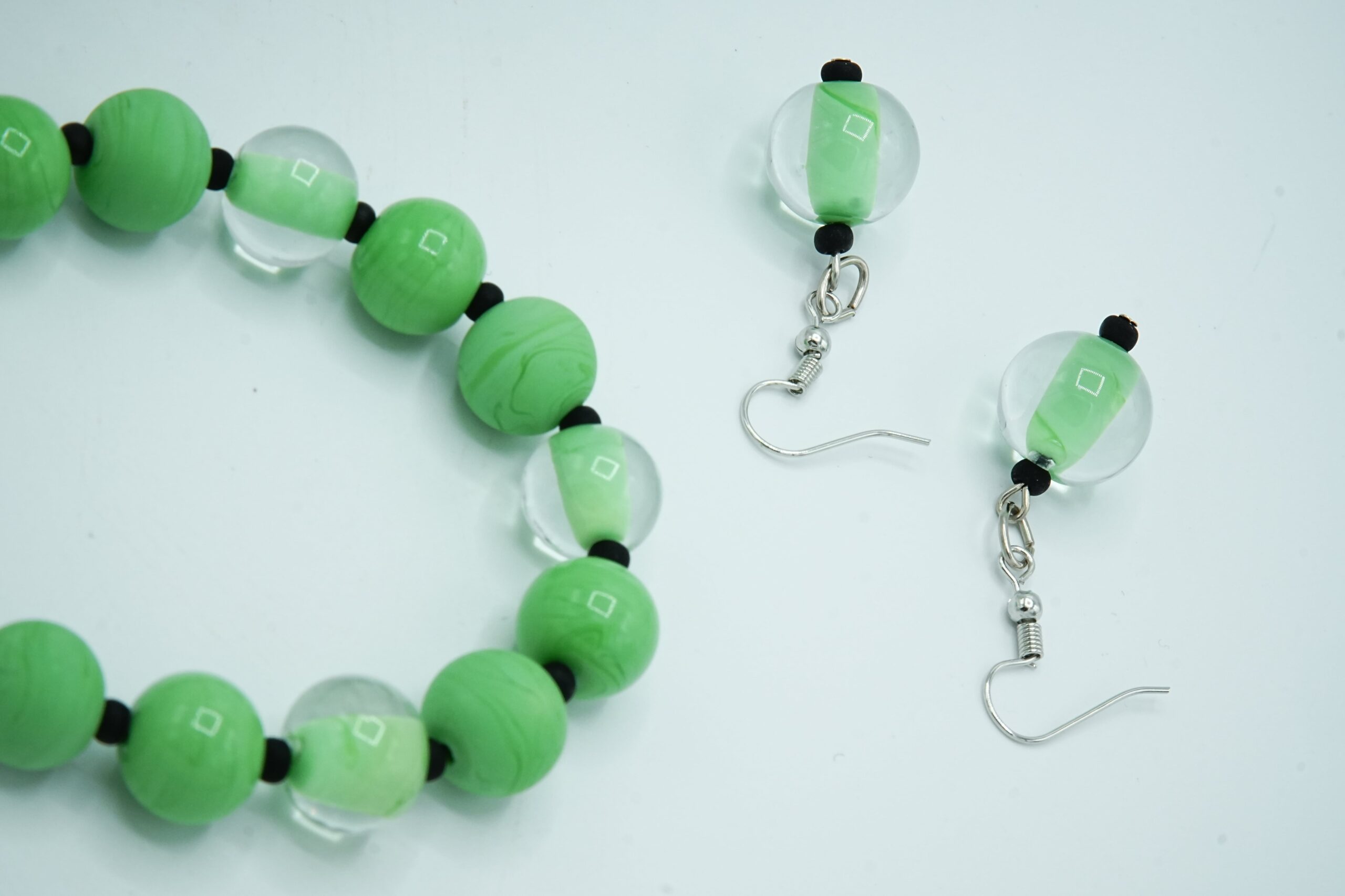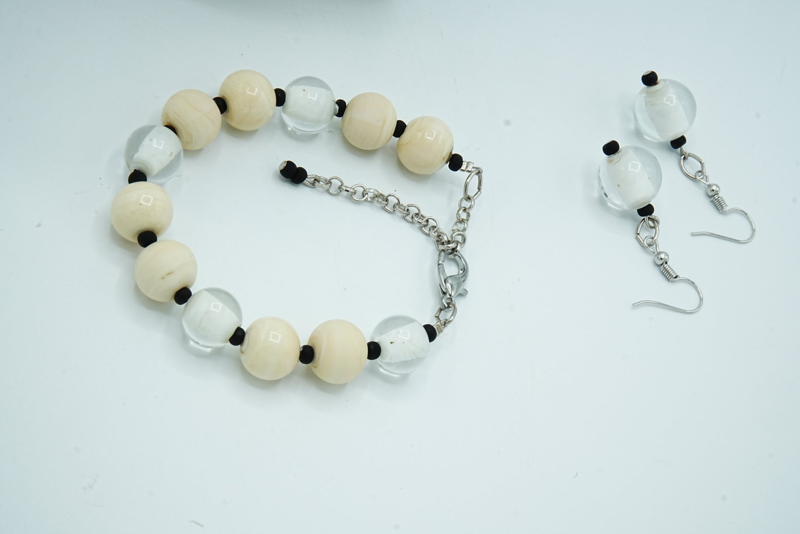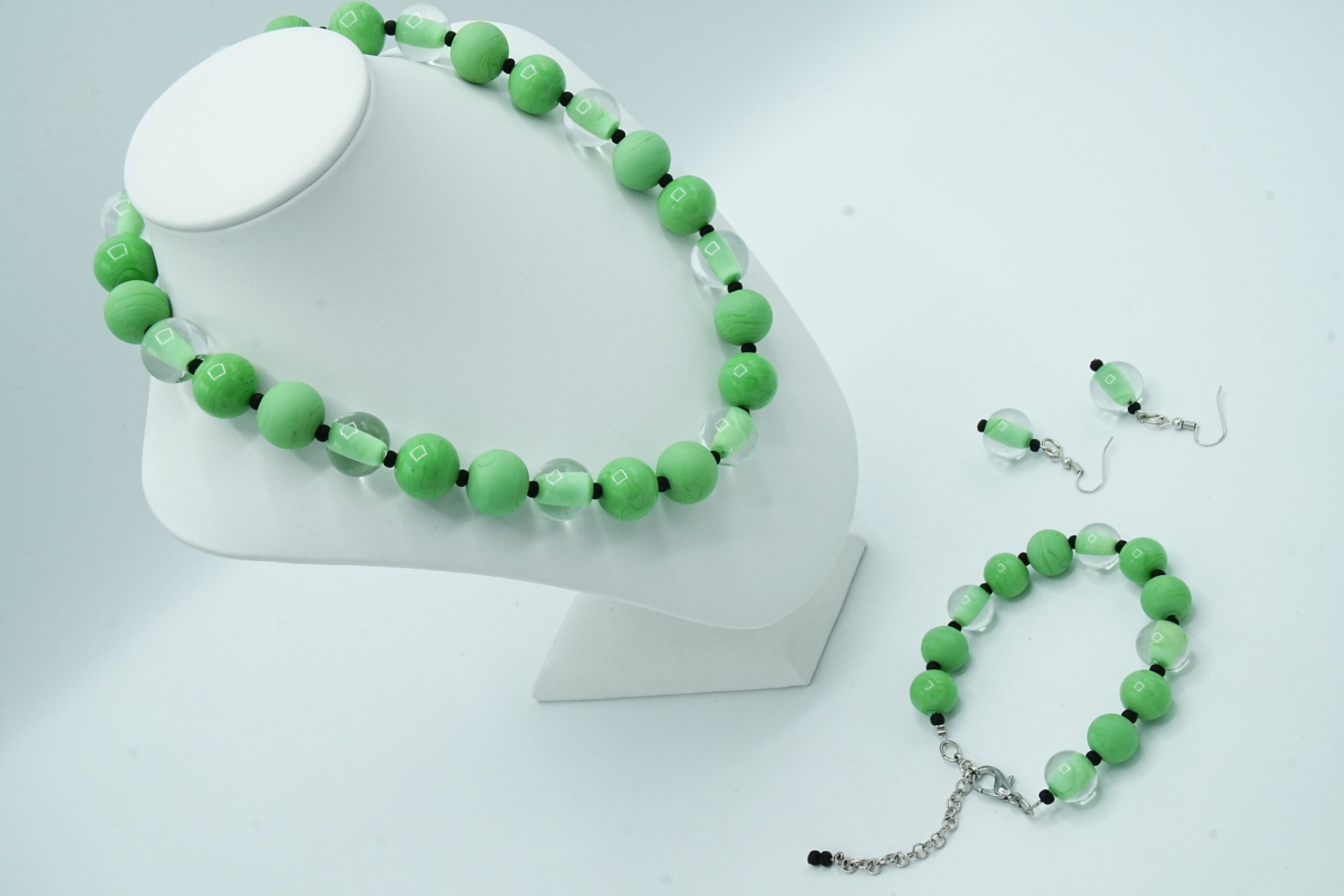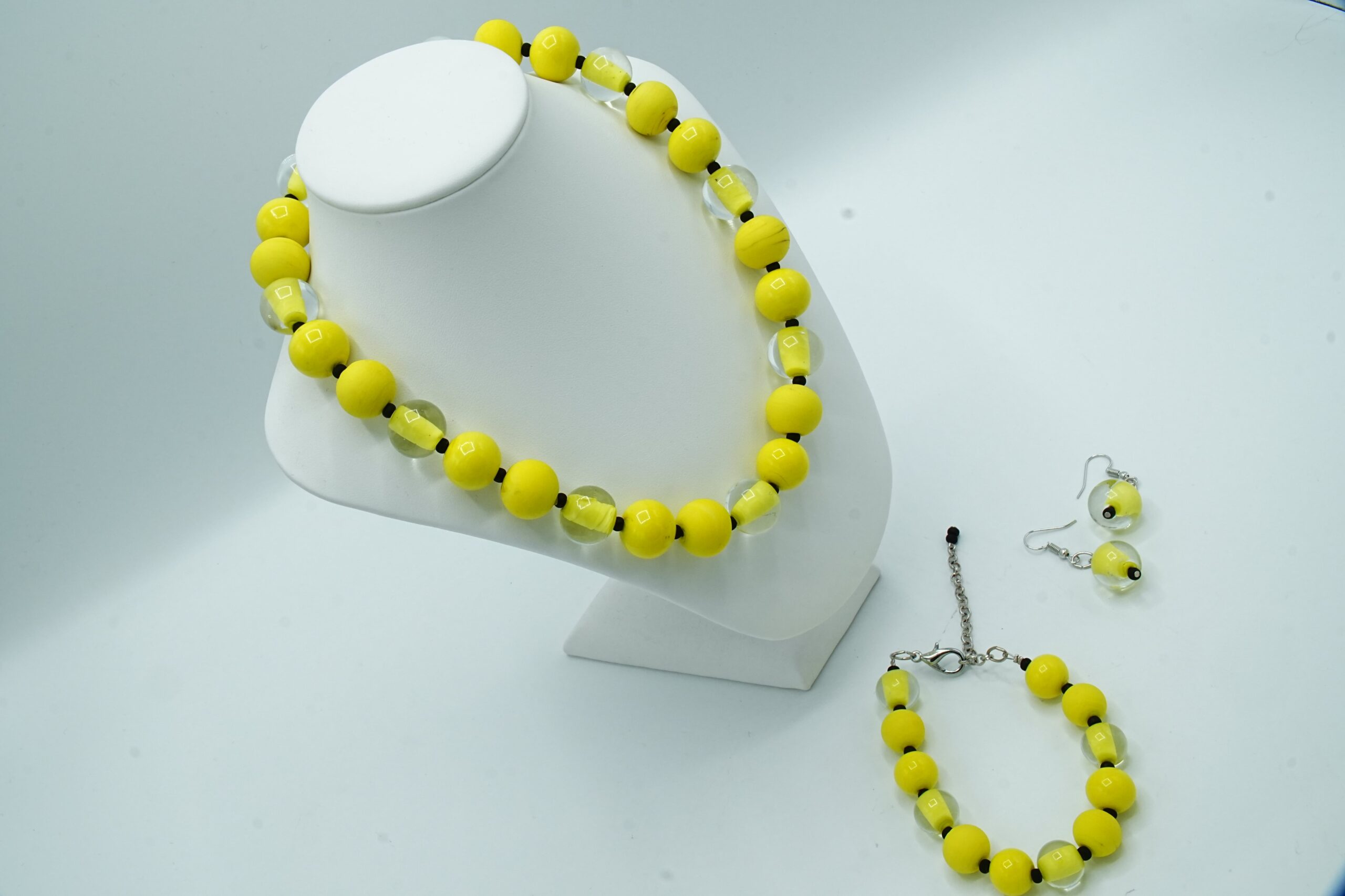 Necklace made with opaque and sandblasted round pearls interspersed with crystal pearls with an opaque core like pearls.