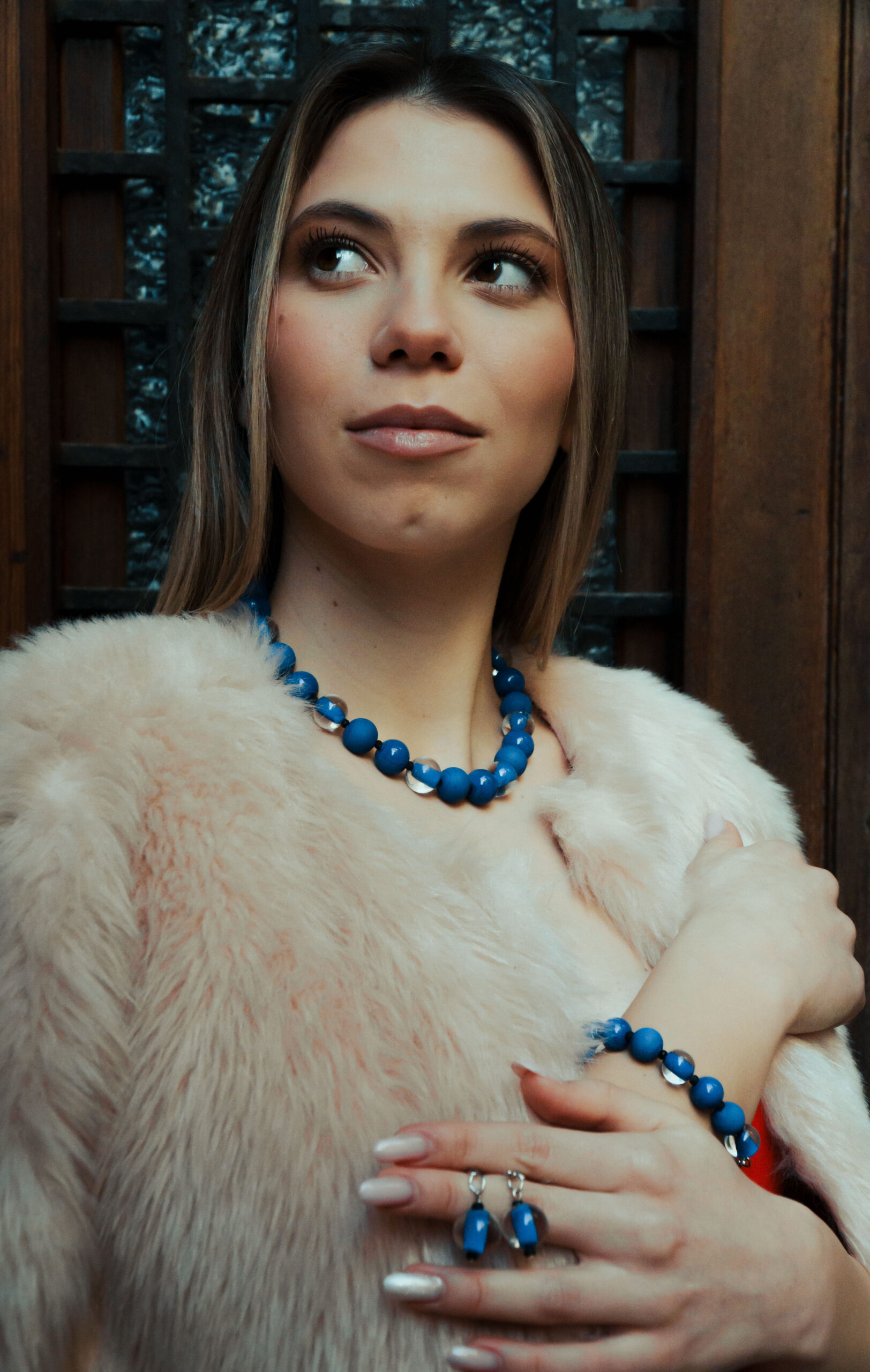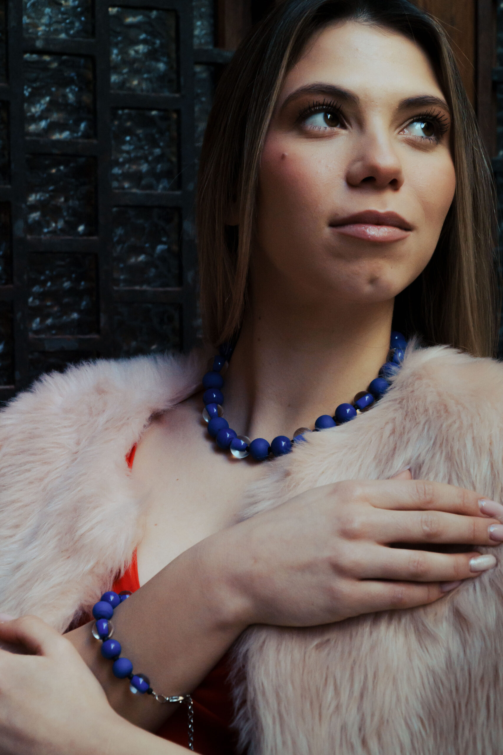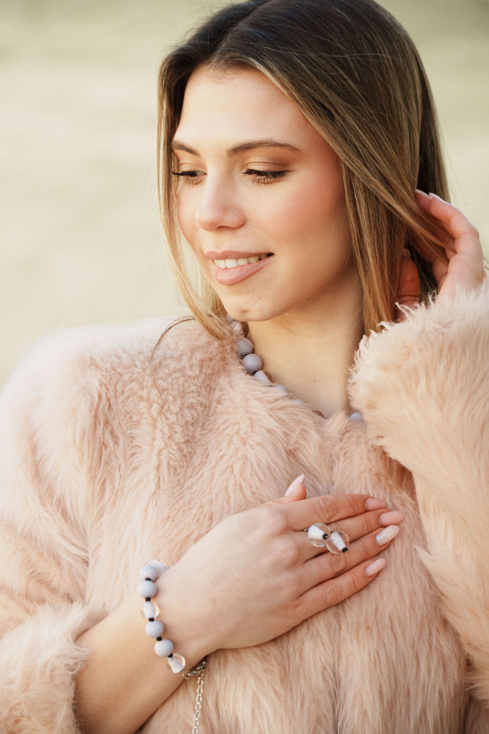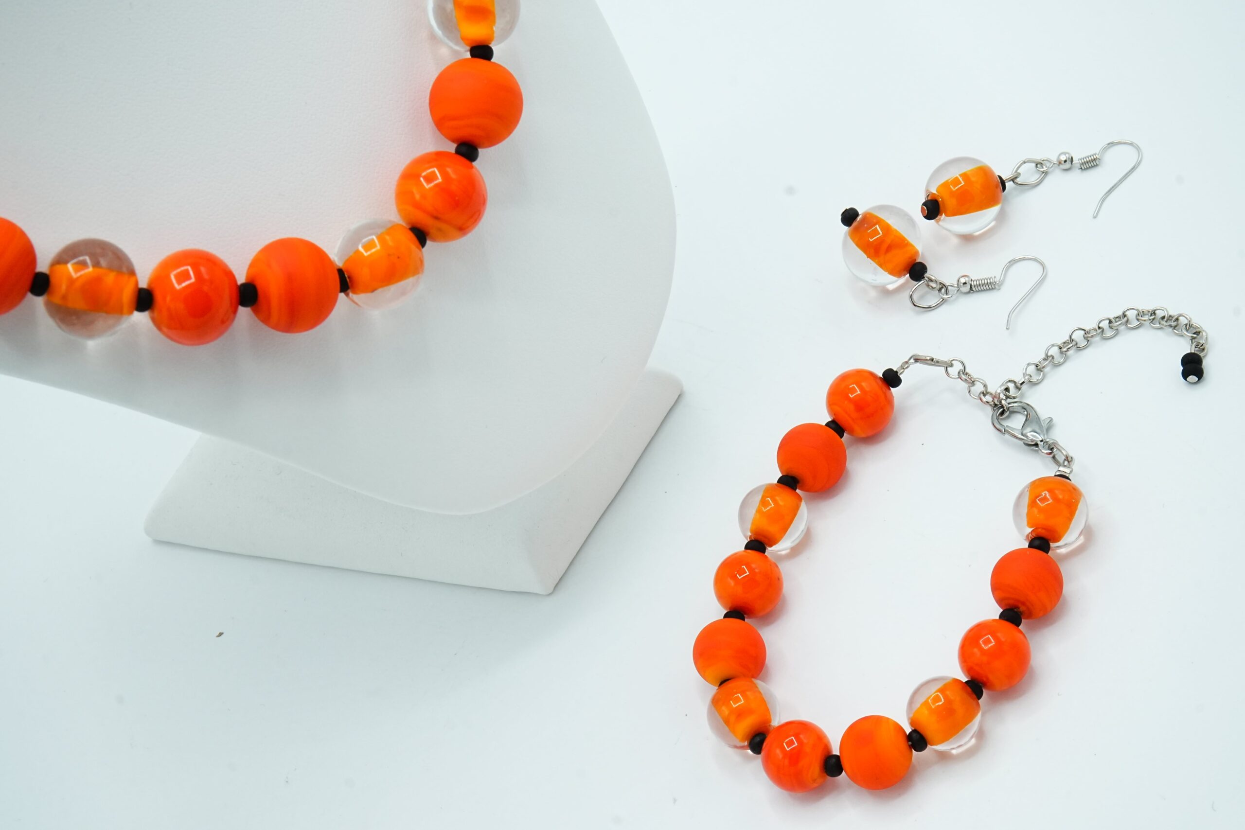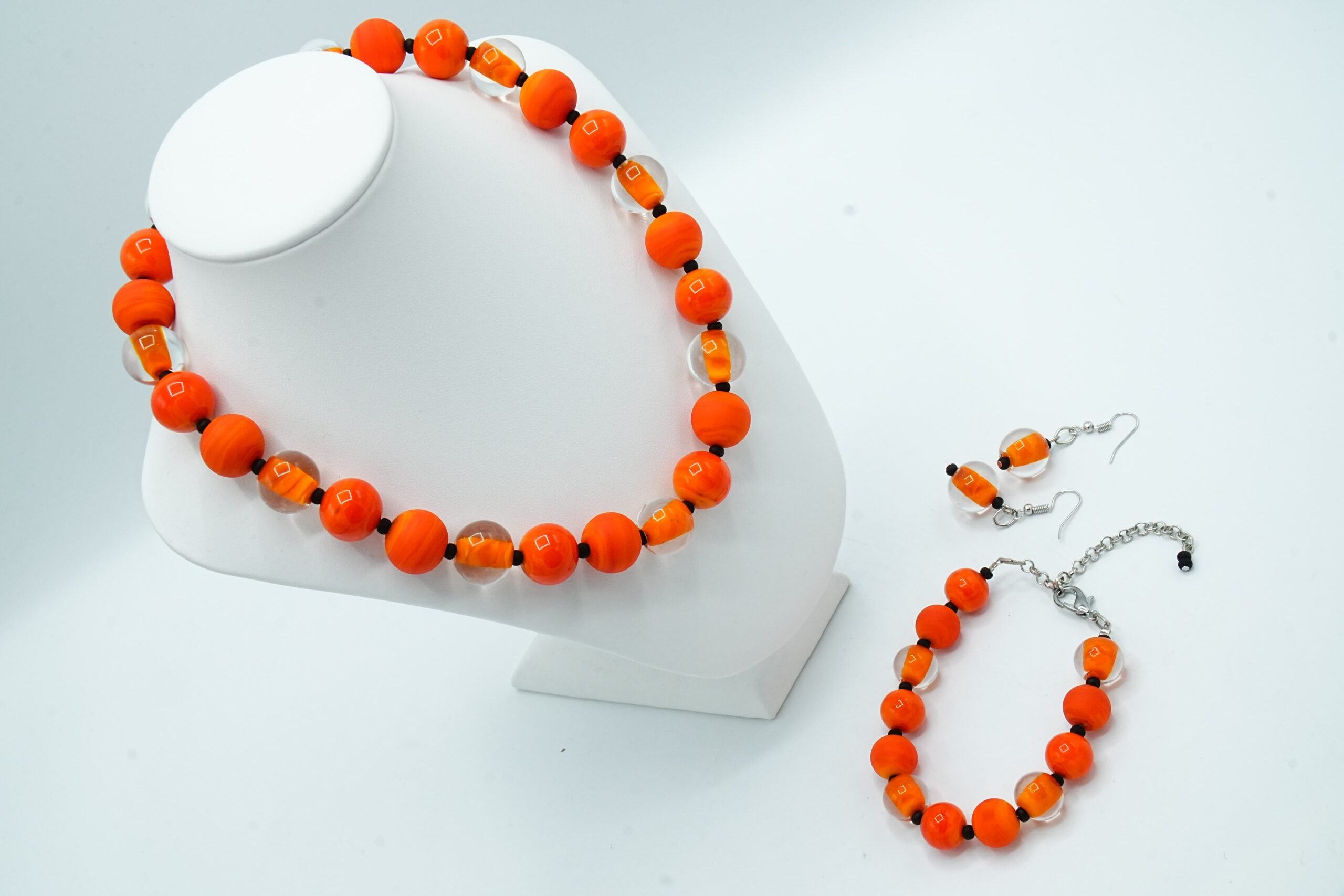 Necklace made with opaque and sandblasted round pearls interspersed with crystal pearls with an opaque core like pearls.