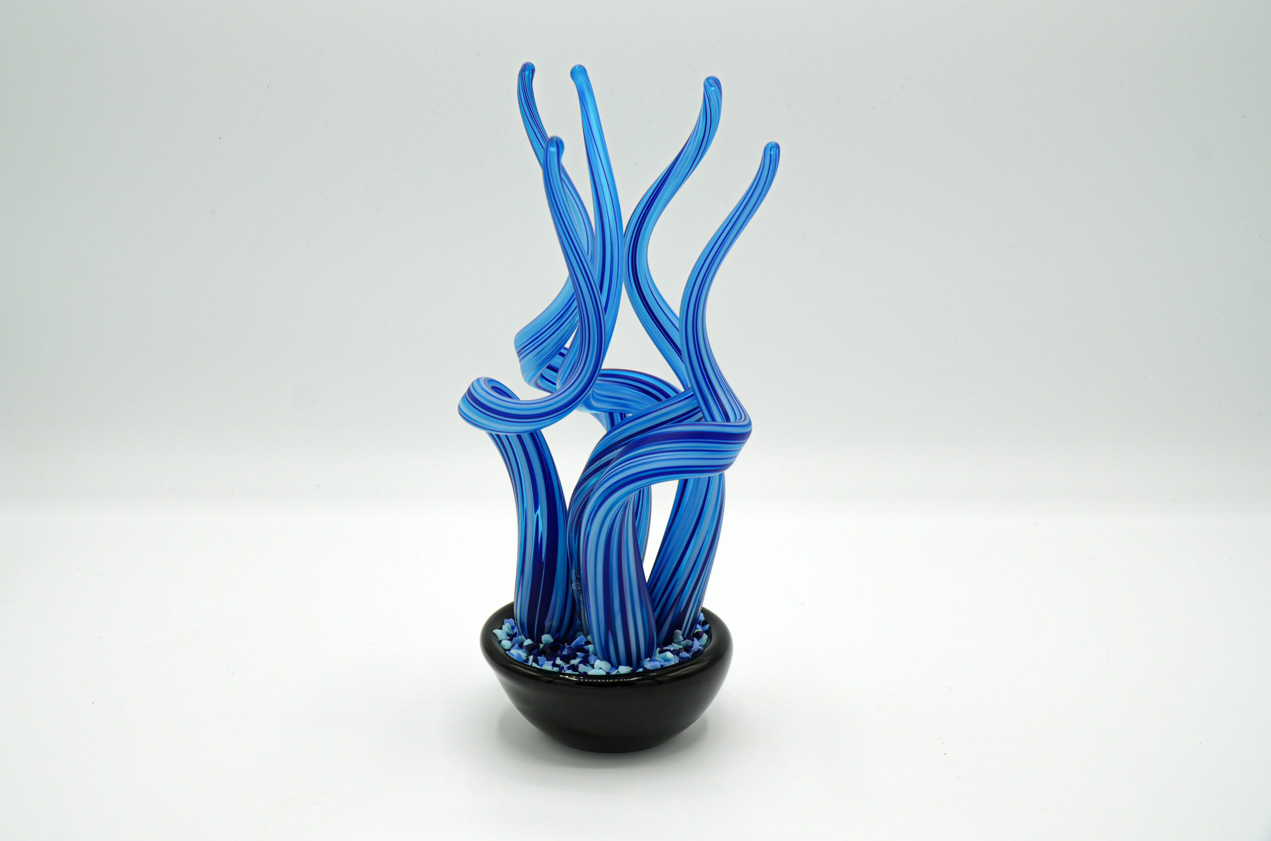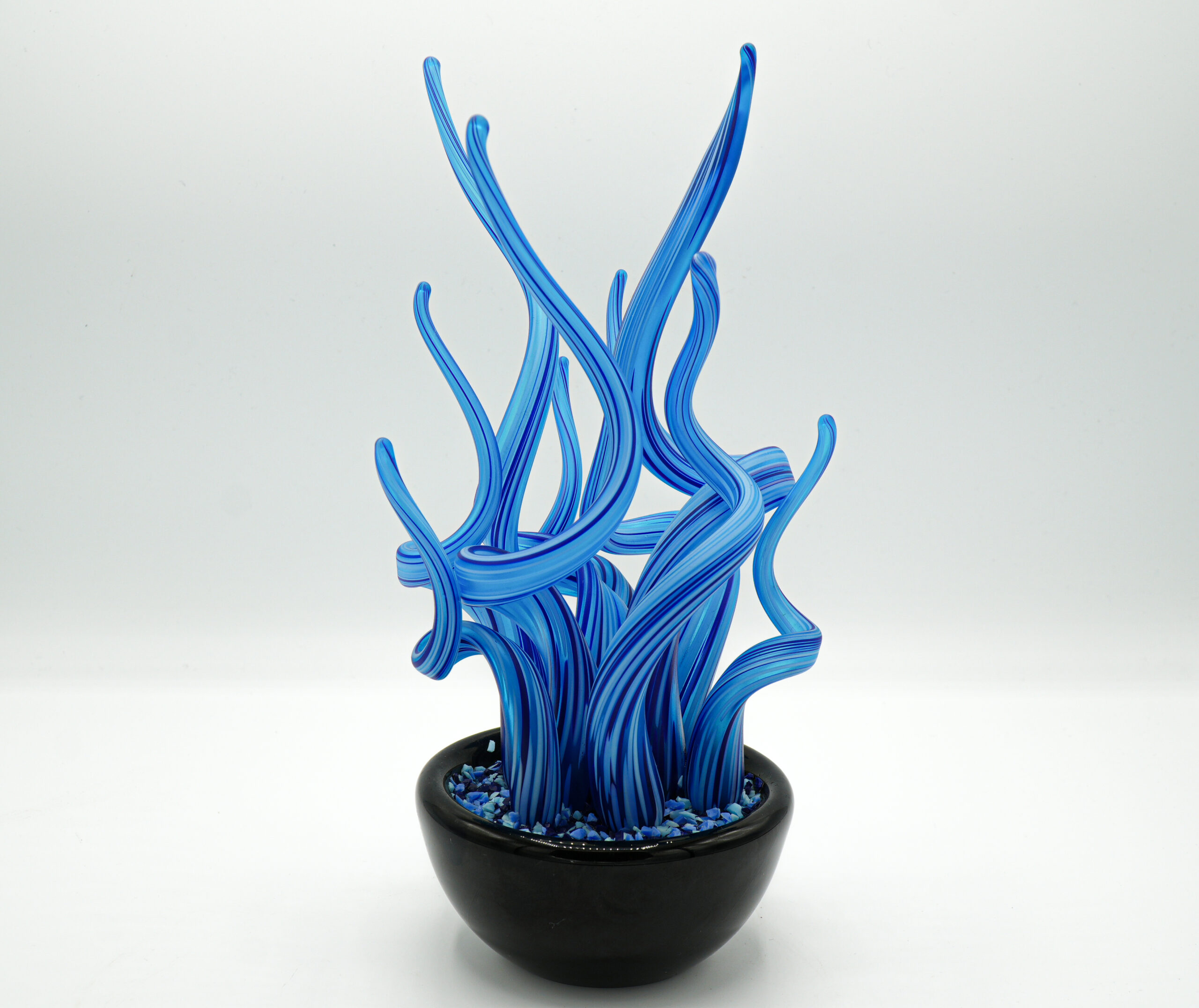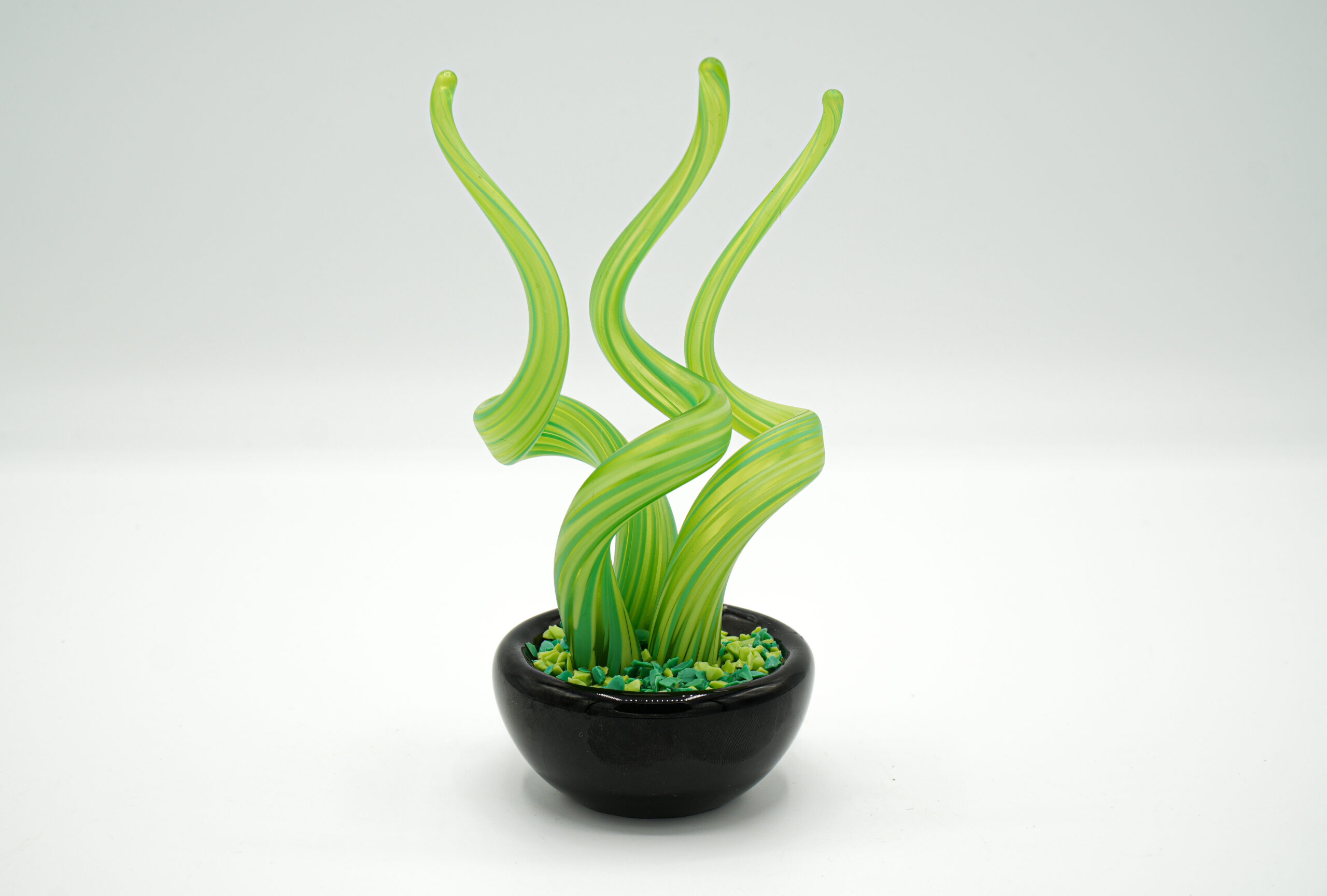 Satin green plant, with branches that yearn for immensity with a black bowl-shaped base containing ground glass of the same color as if it were soil.