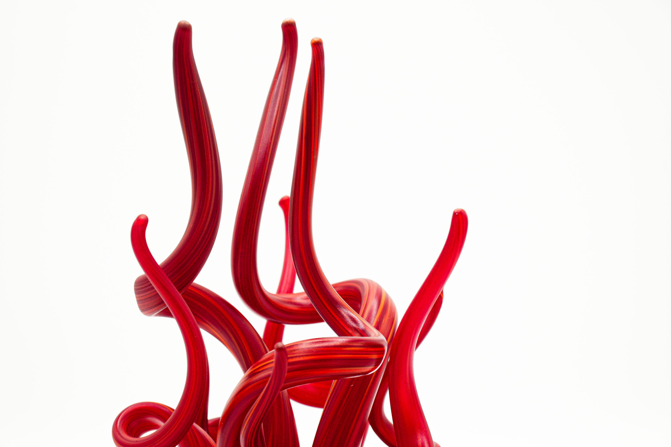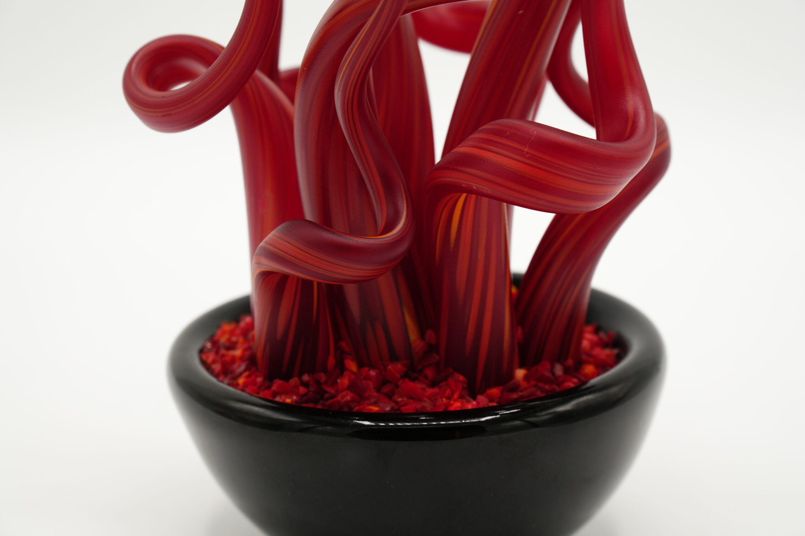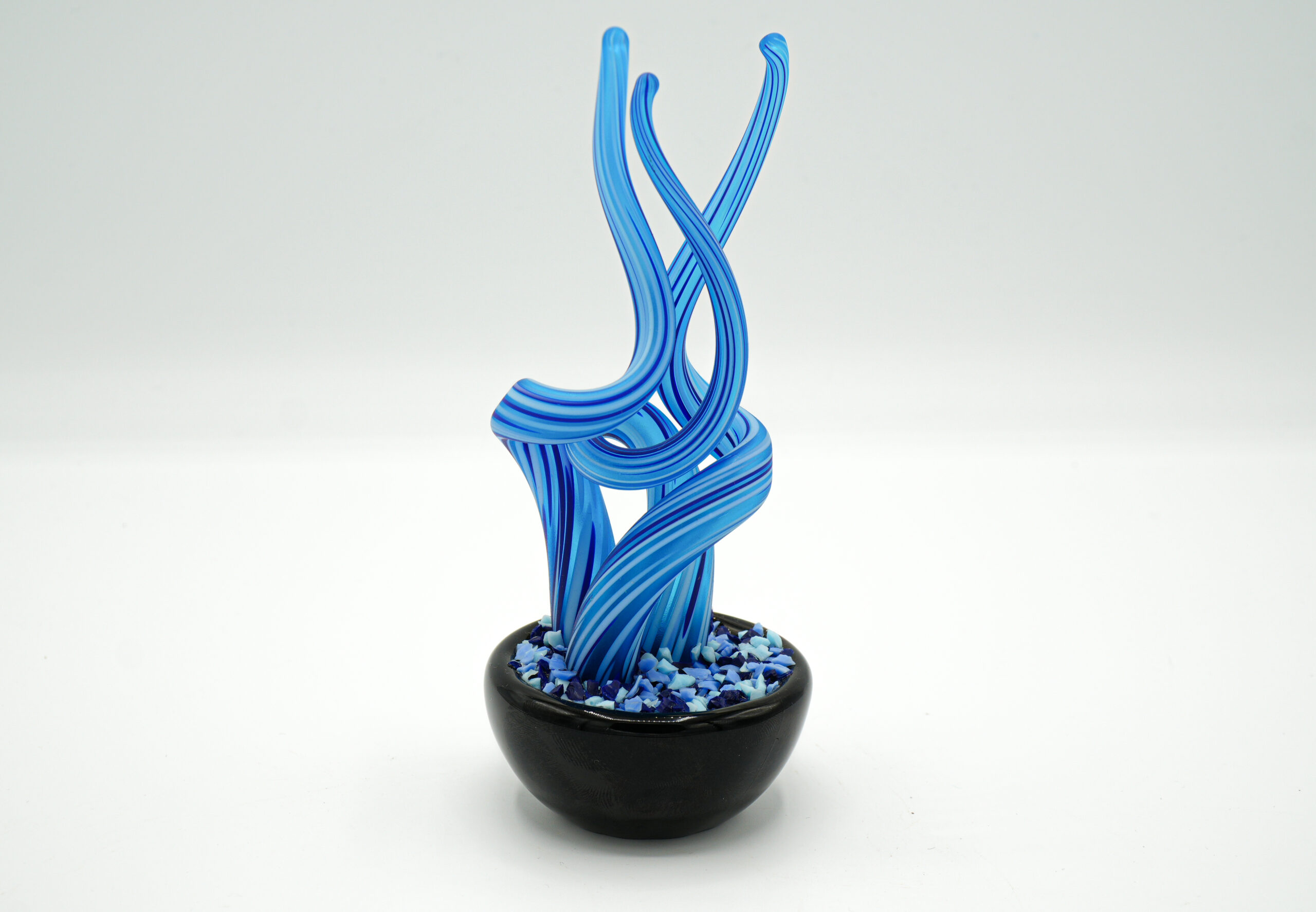 Satin green plant, with branches that yearn for immensity with a black bowl-shaped base containing ground glass of the same color as if it were soil.