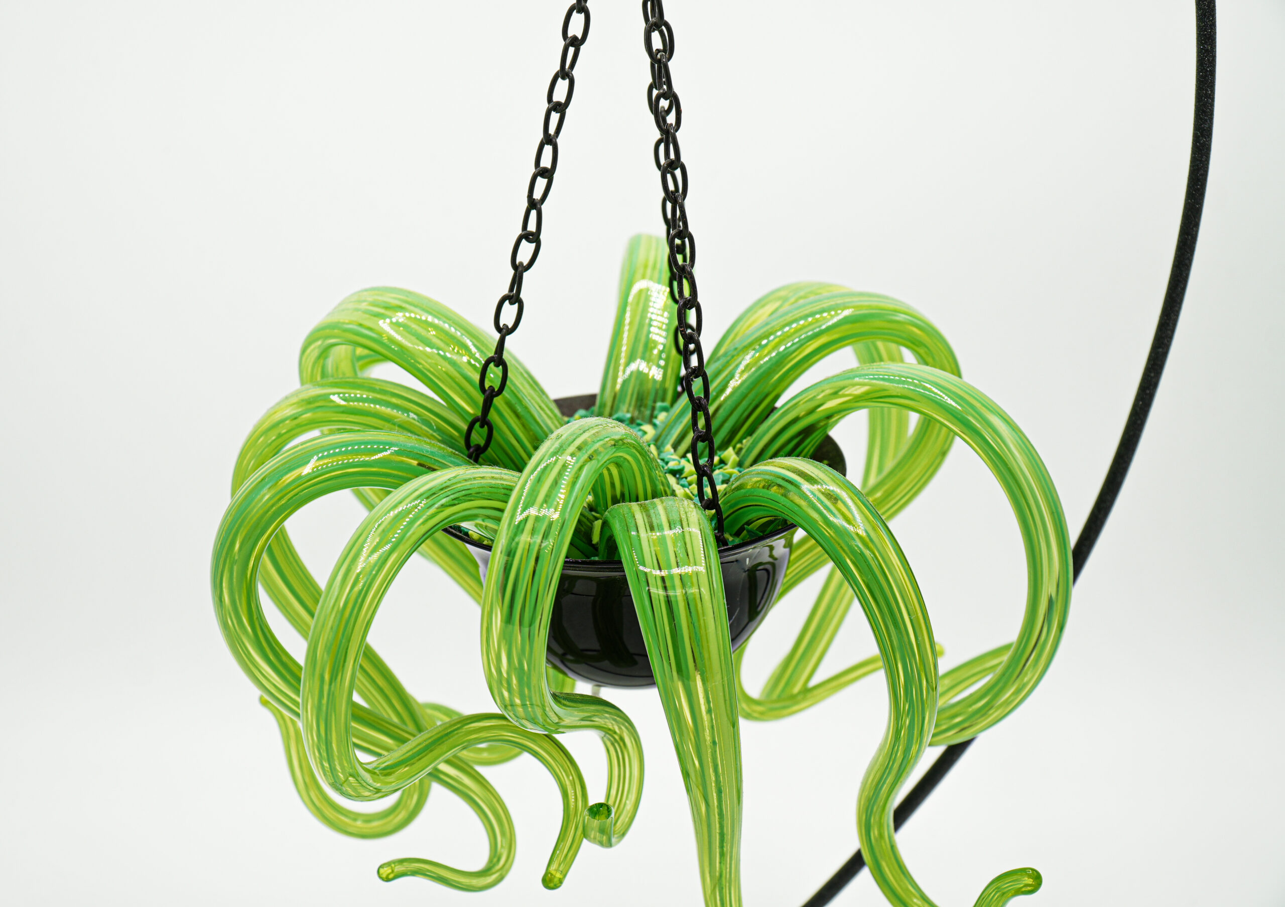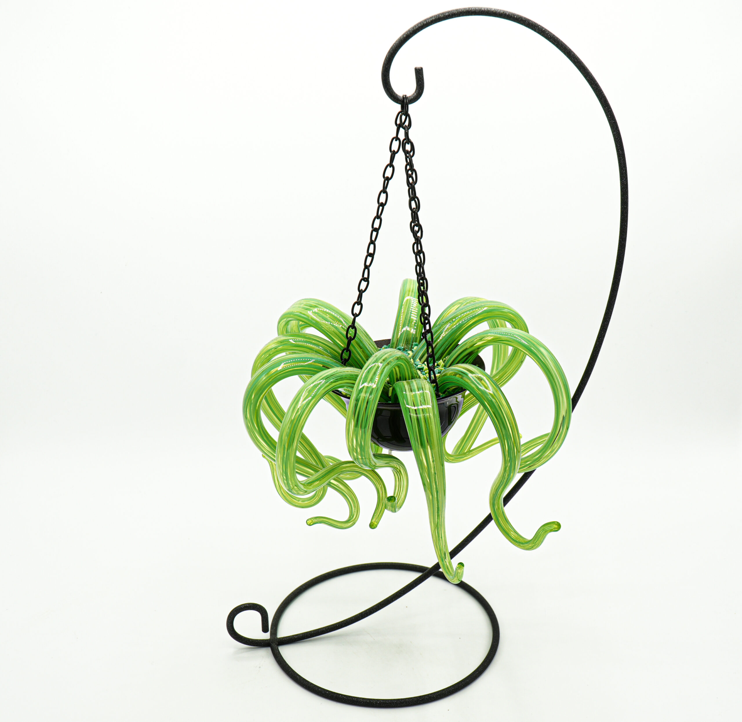 Plant in the shape of a weeping salige resting on a base in the shape of a black watch glass. The plant is supported by an elegant wrought iron frame.
