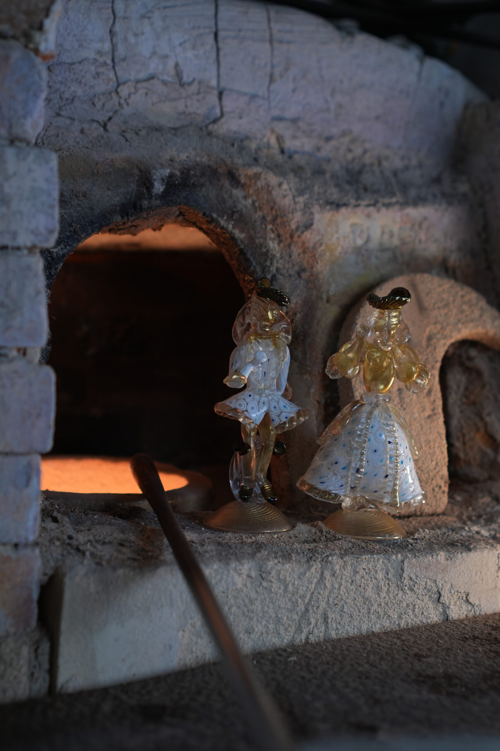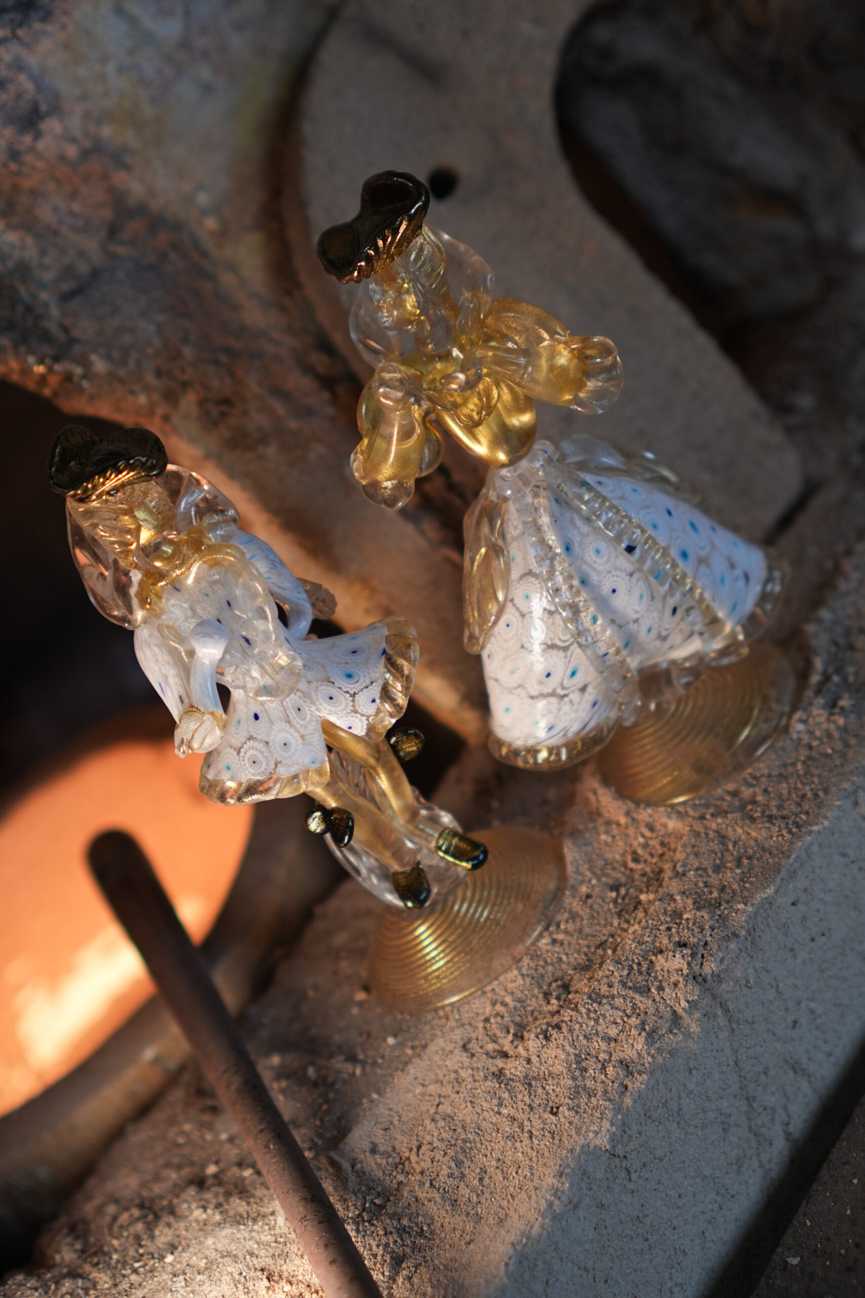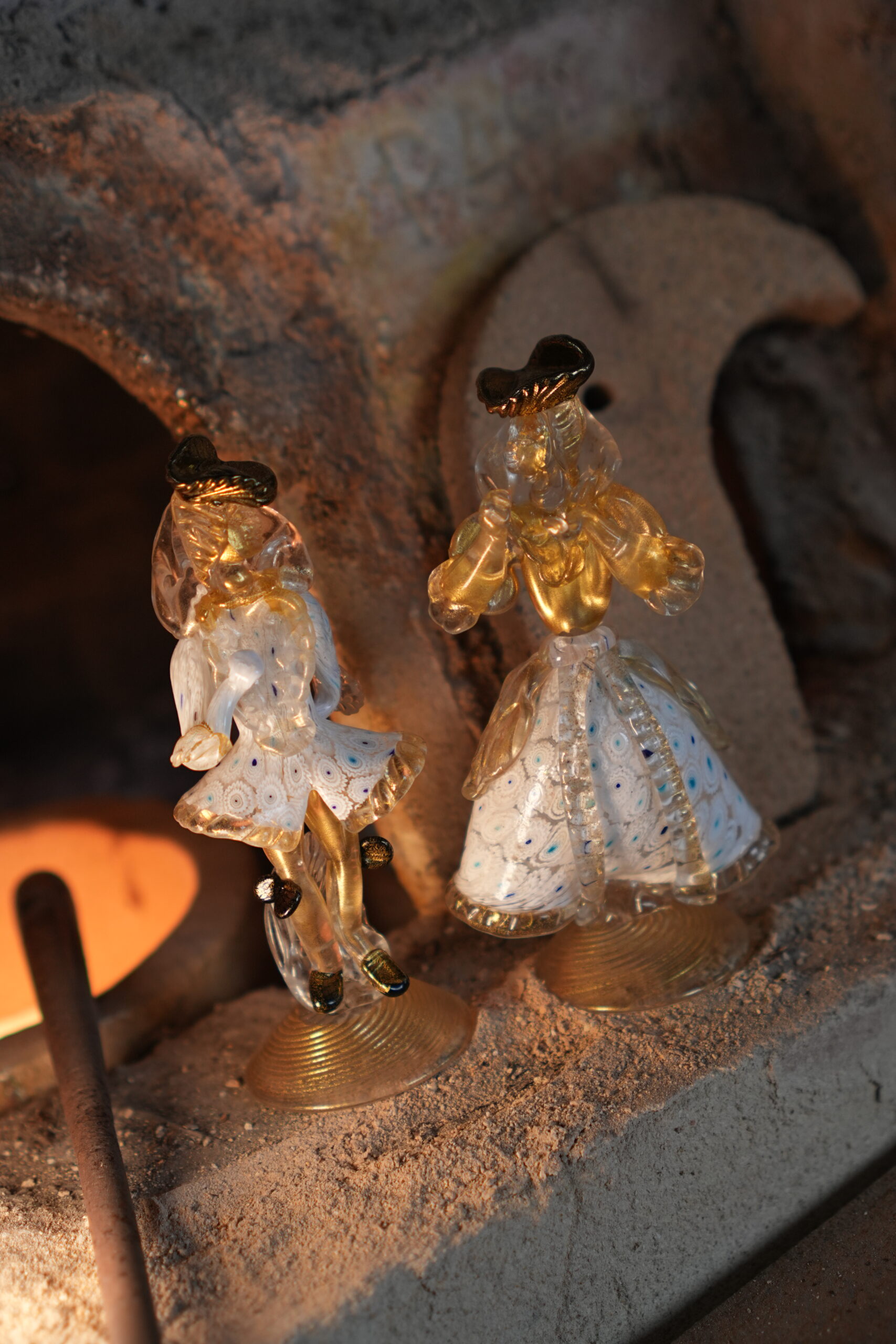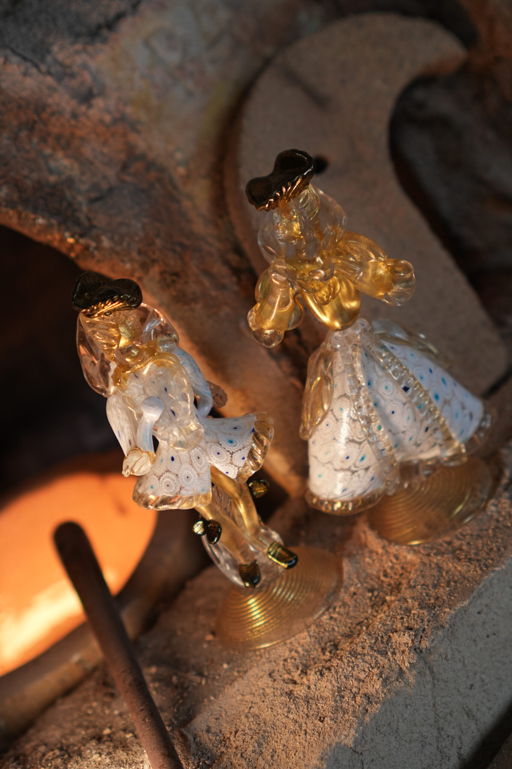 Small pair of Venetian statuettes in white murrine with 24-karat gold body. Collectible works, unique pieces.