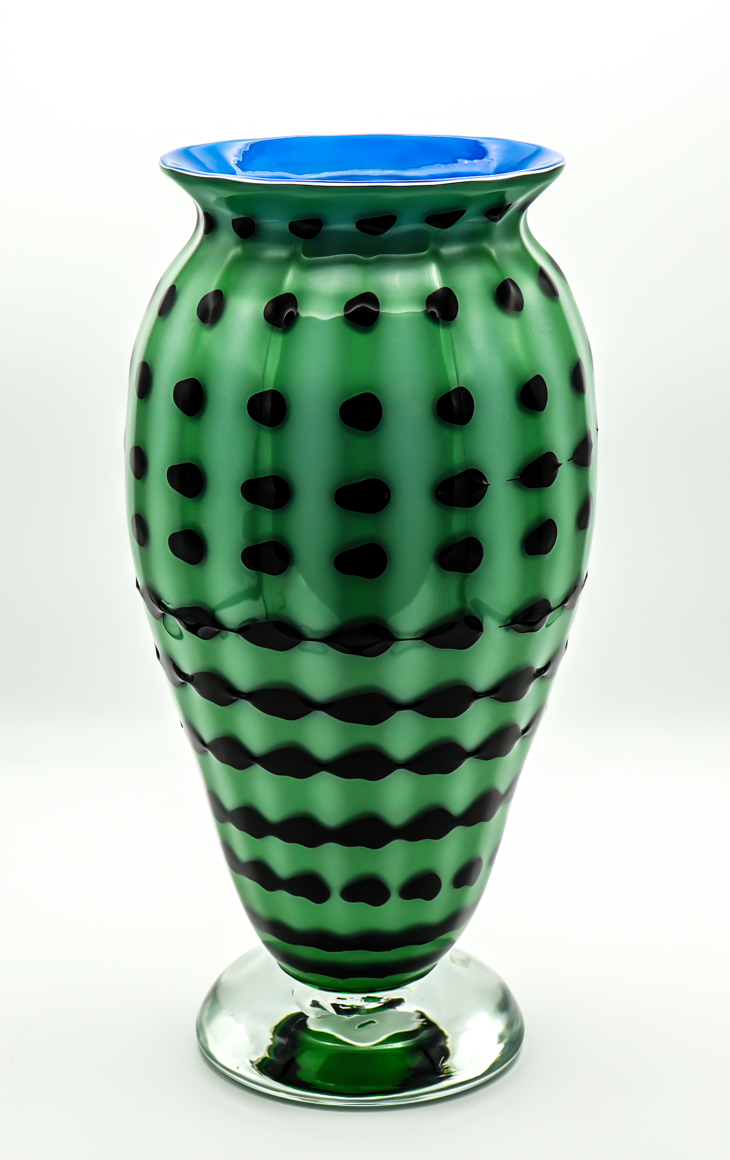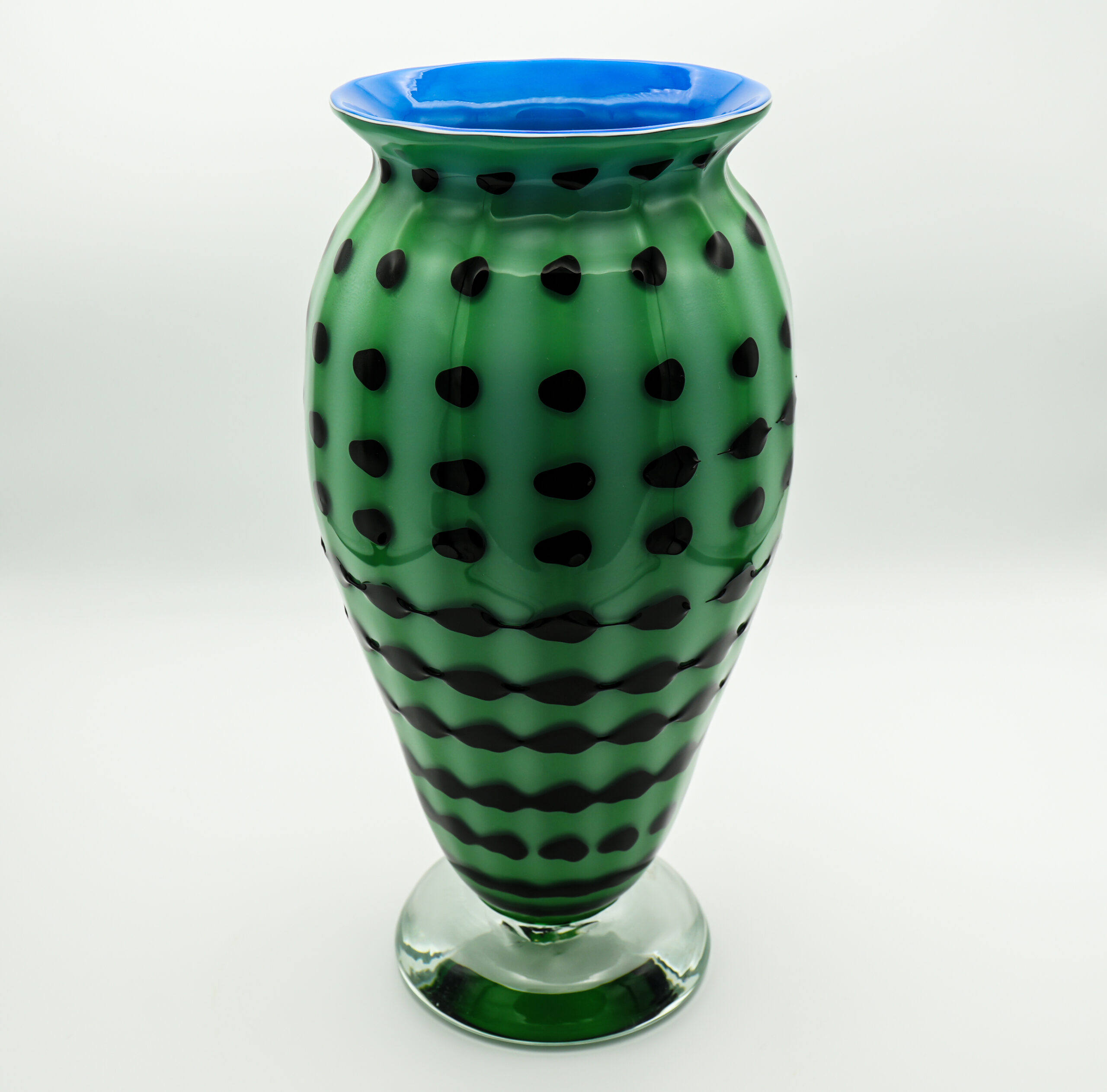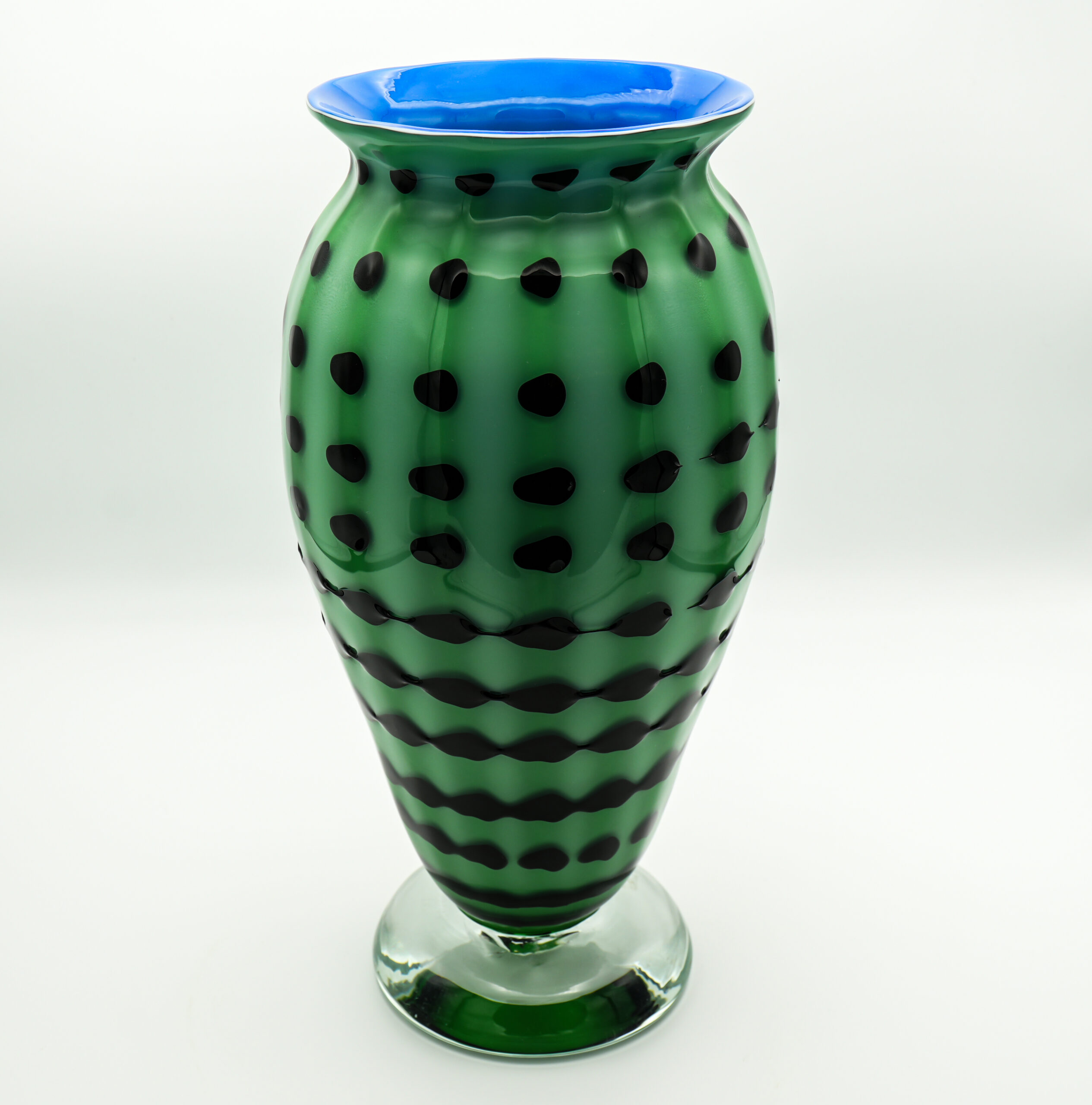 Green triumph vase with blue interior, black spiral all around the body worked with a special technique. Important base in crystal color. Unique piece
