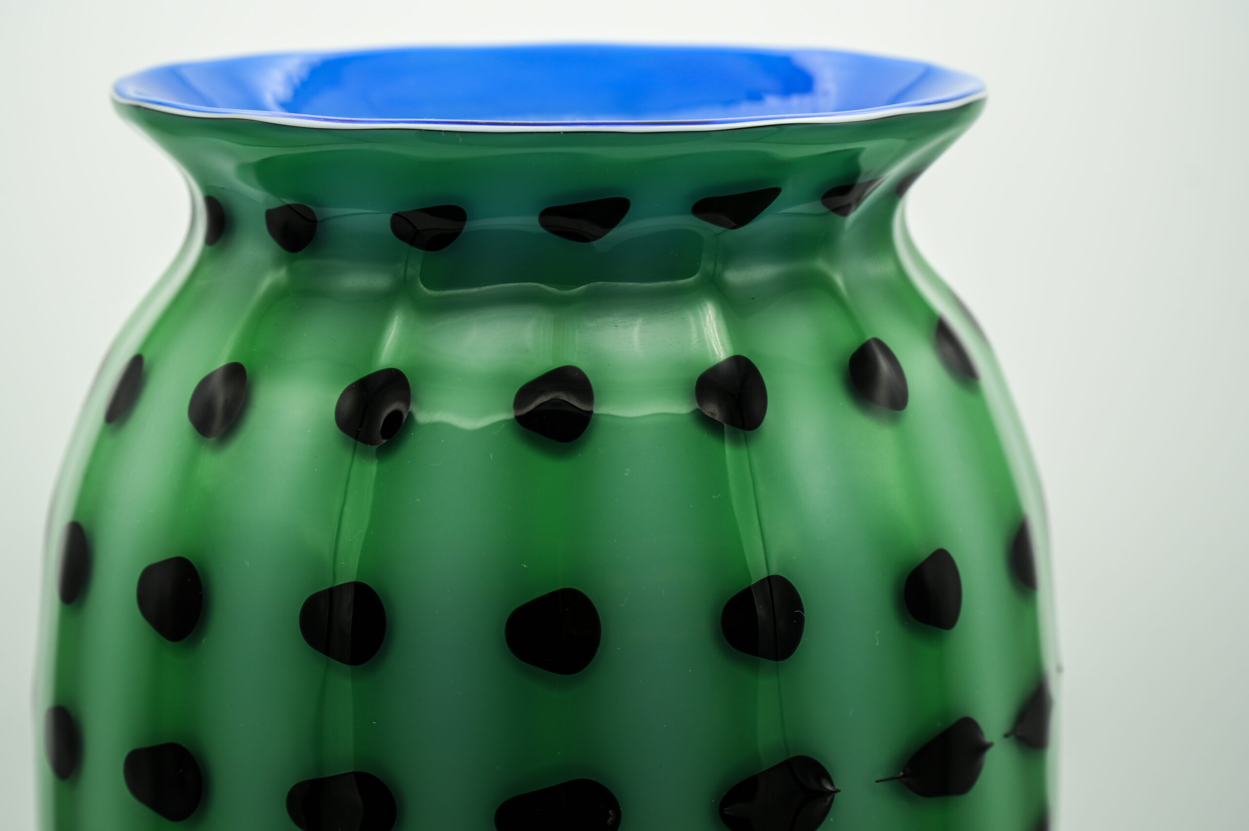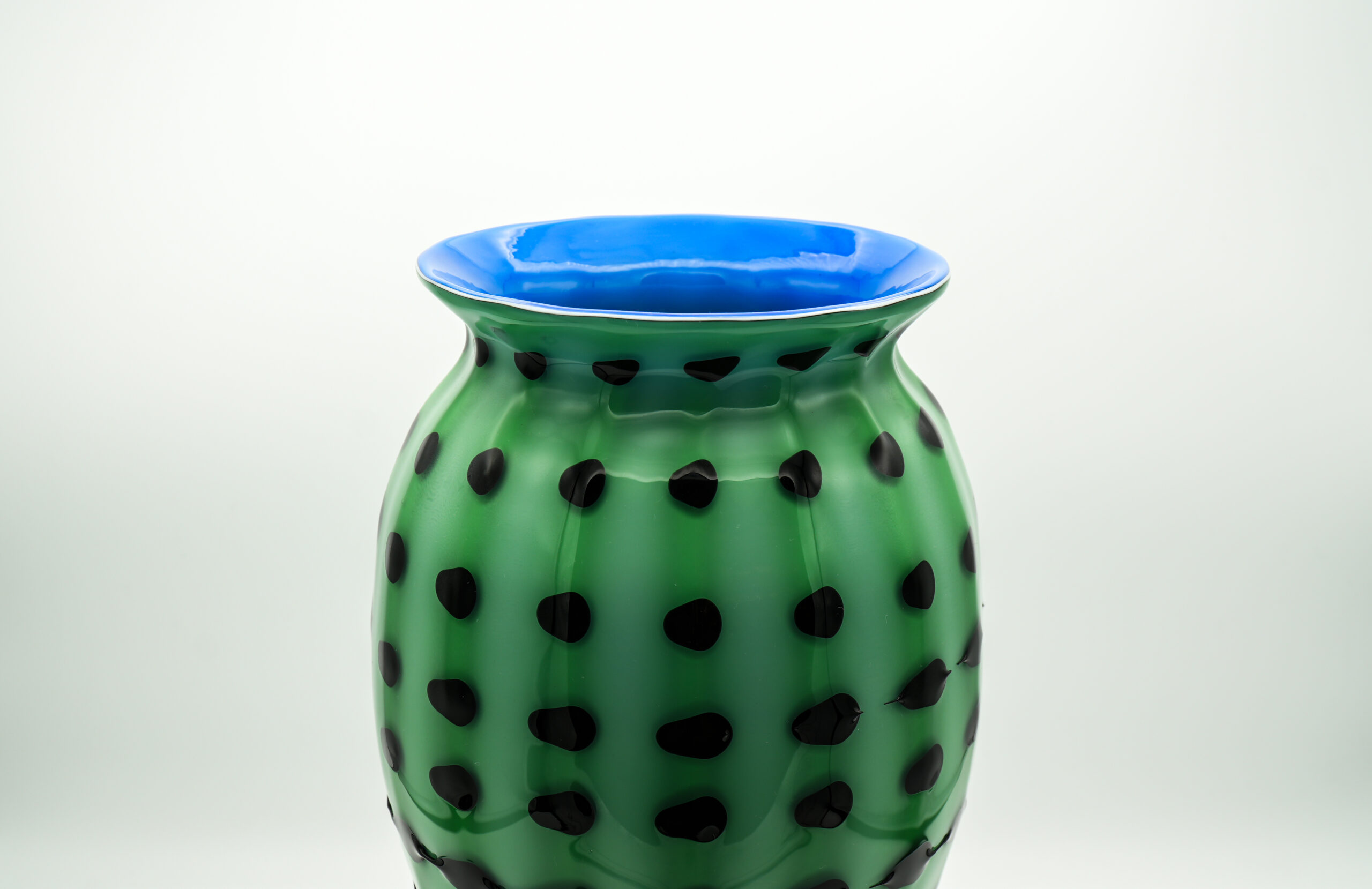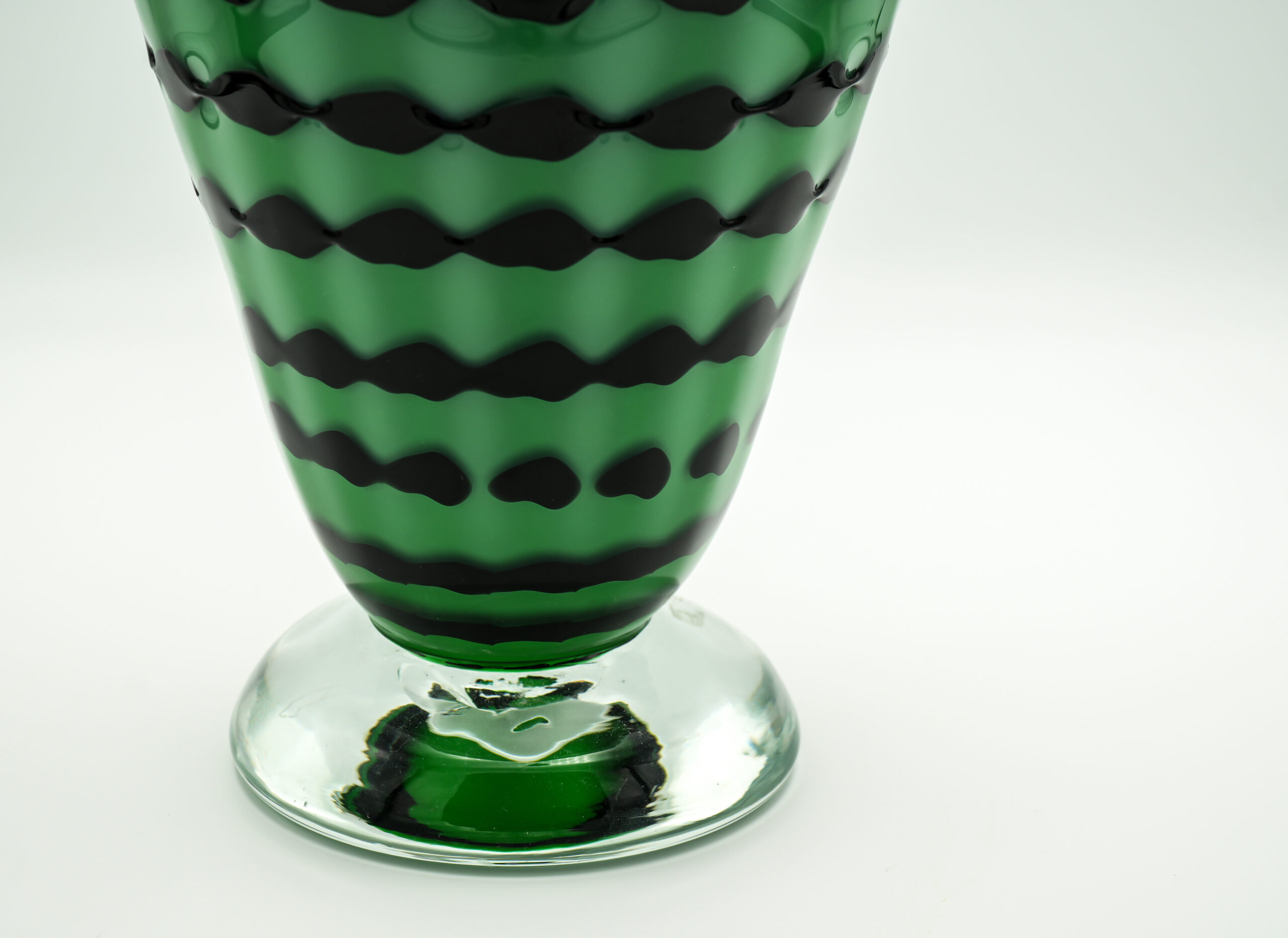Green triumph vase with blue interior, black spiral all around the body worked with a special technique. Important base in crystal color. Unique piece