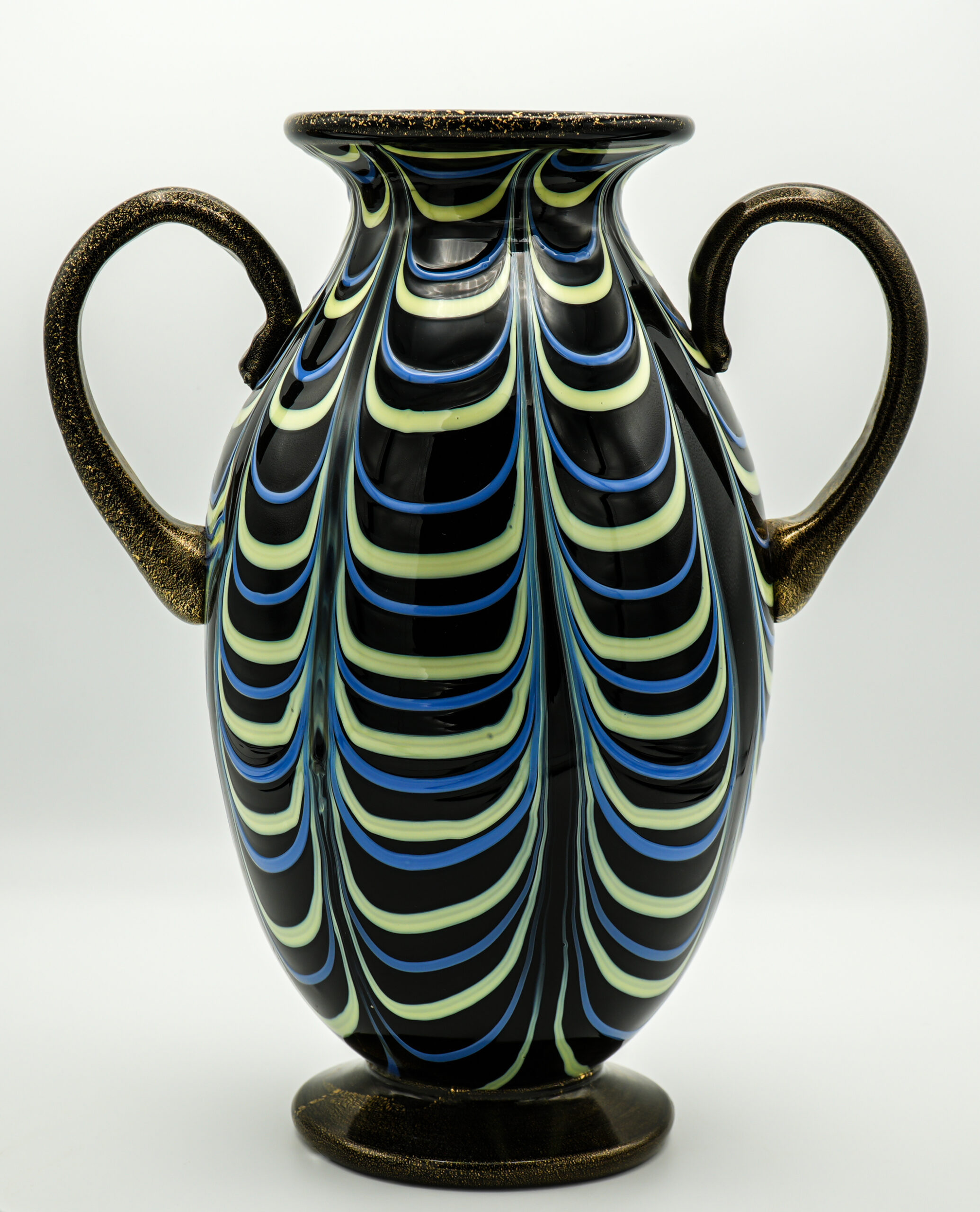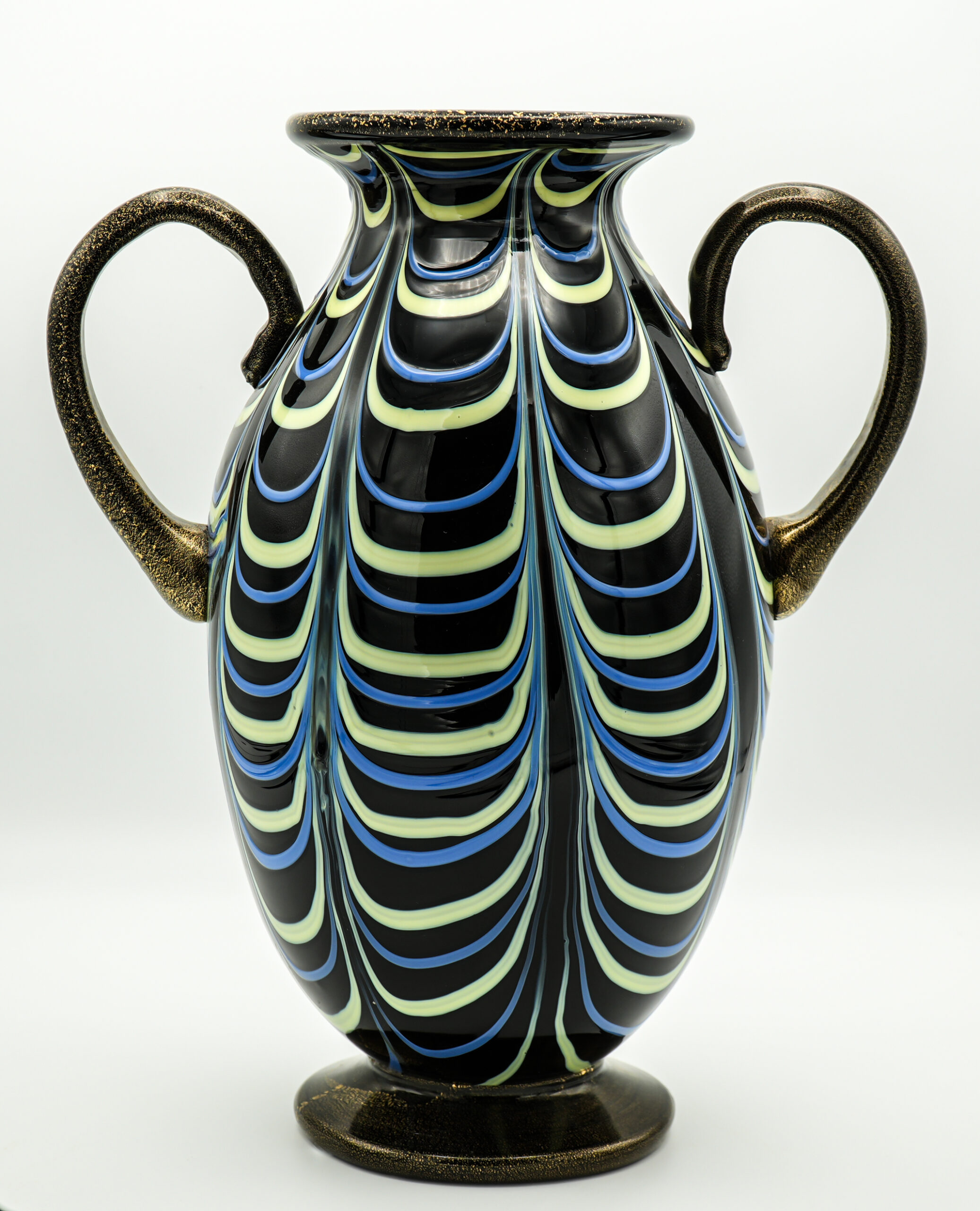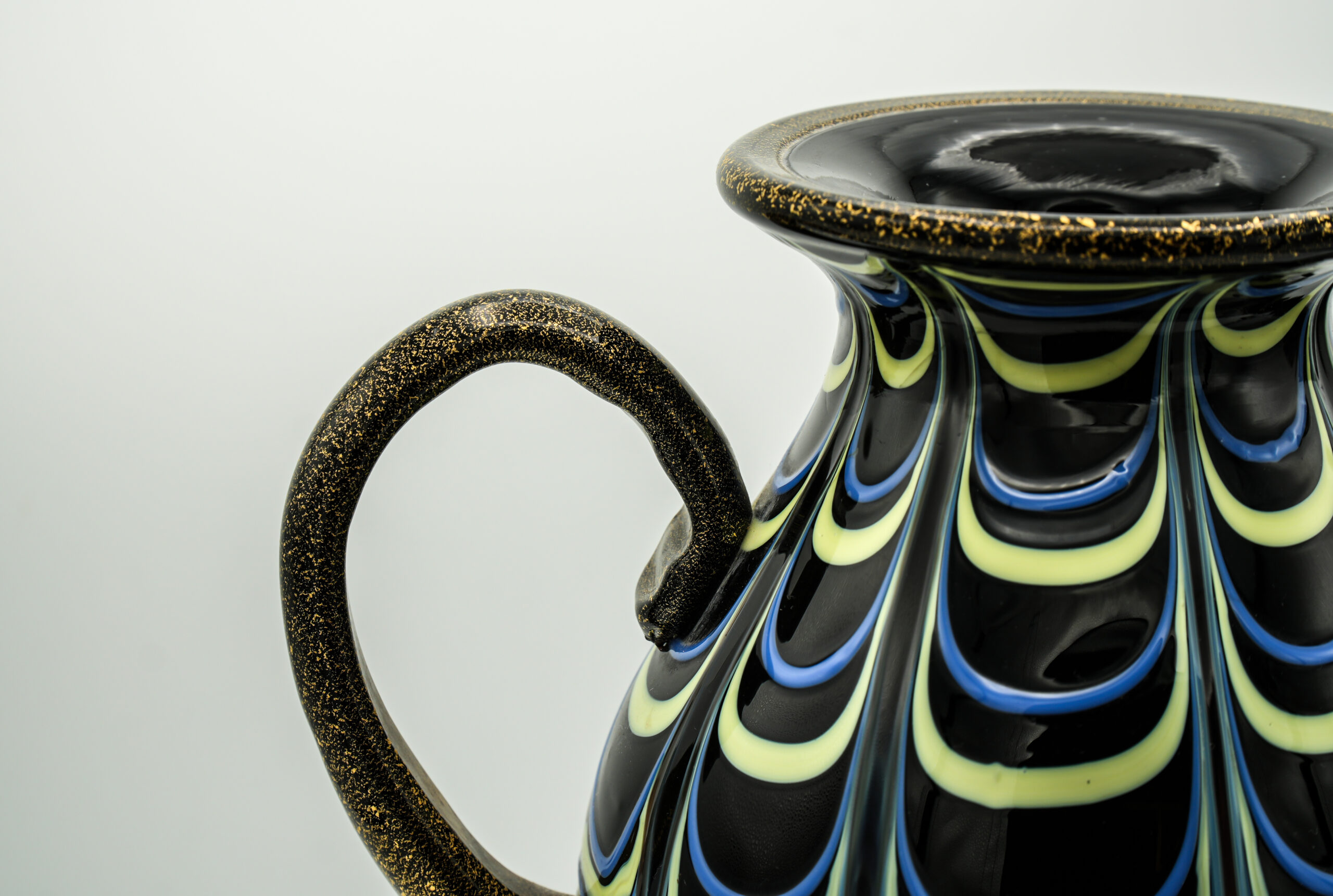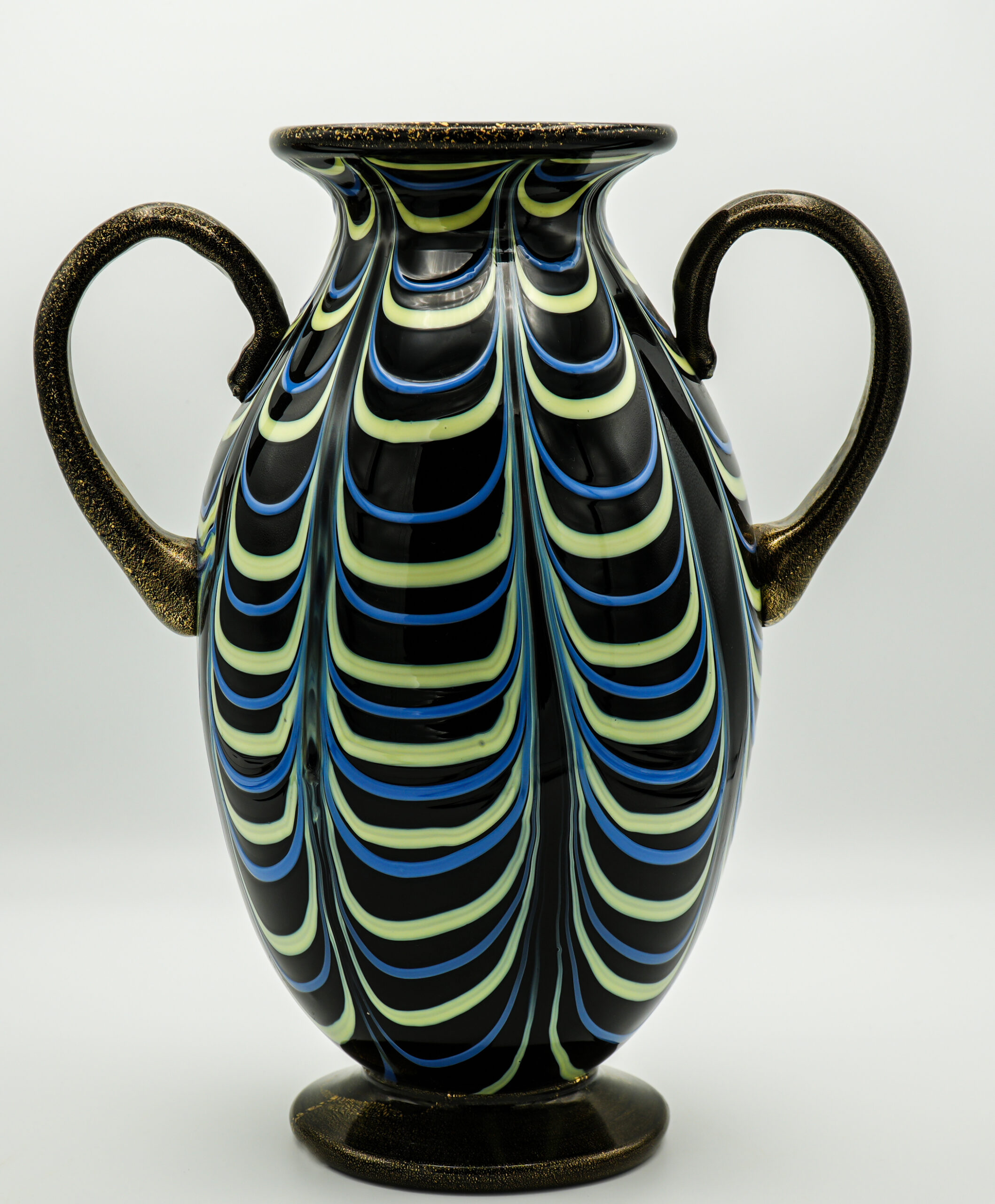 Amphora-shaped vase worked with the “Phoenician” technique, blue and yellow spirals. On the body there are two black and gold tips, like the edge and the base.