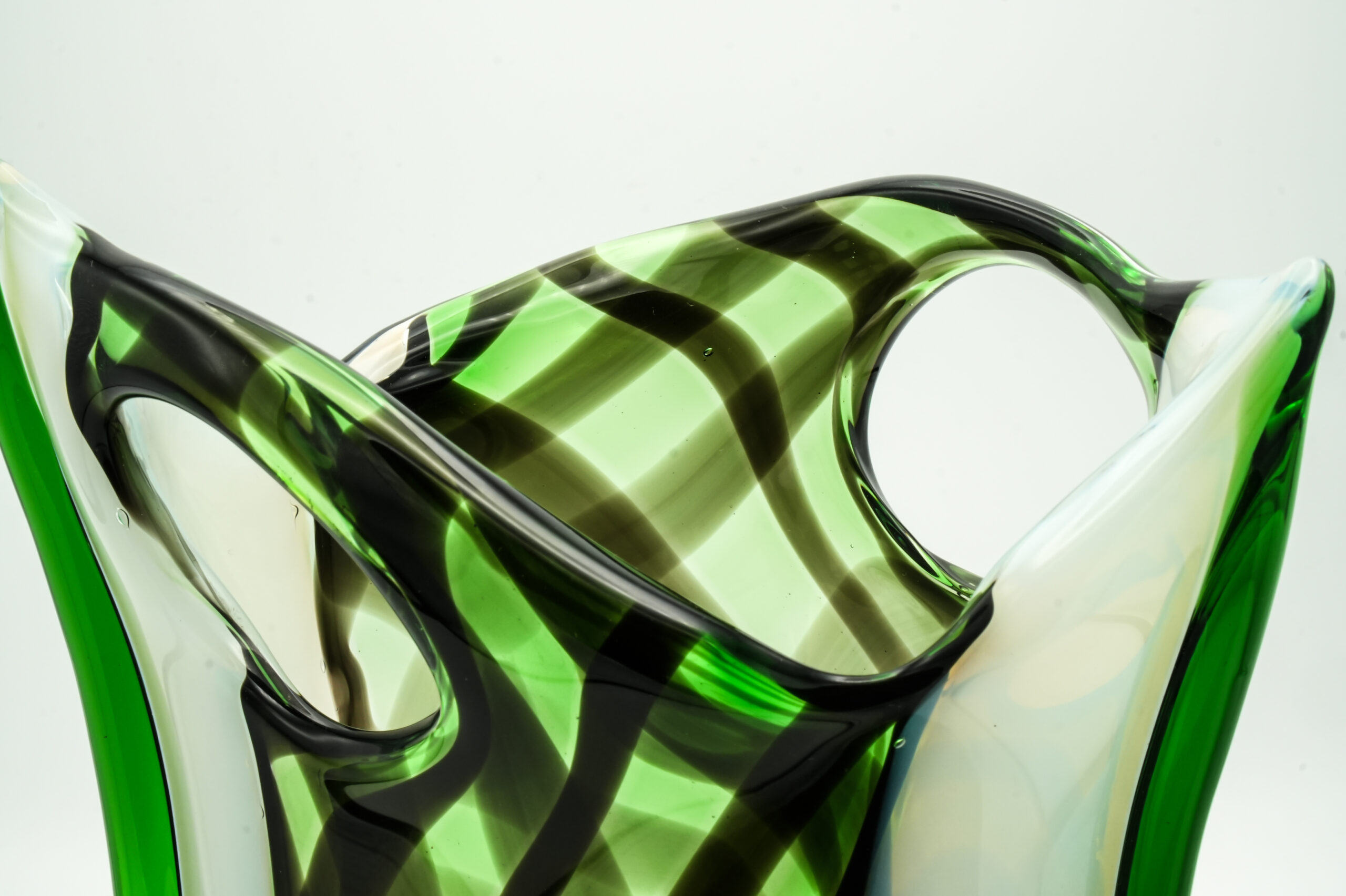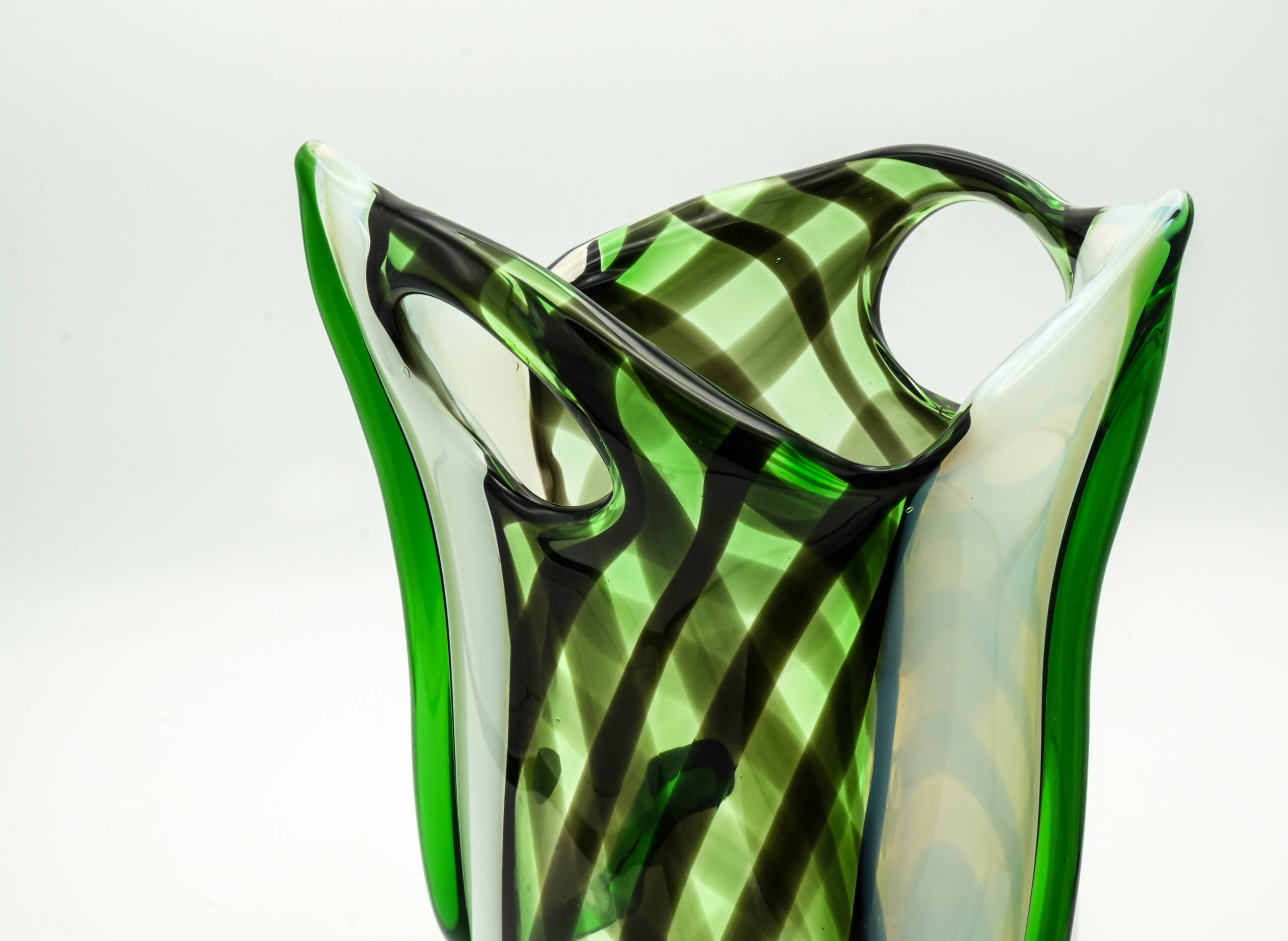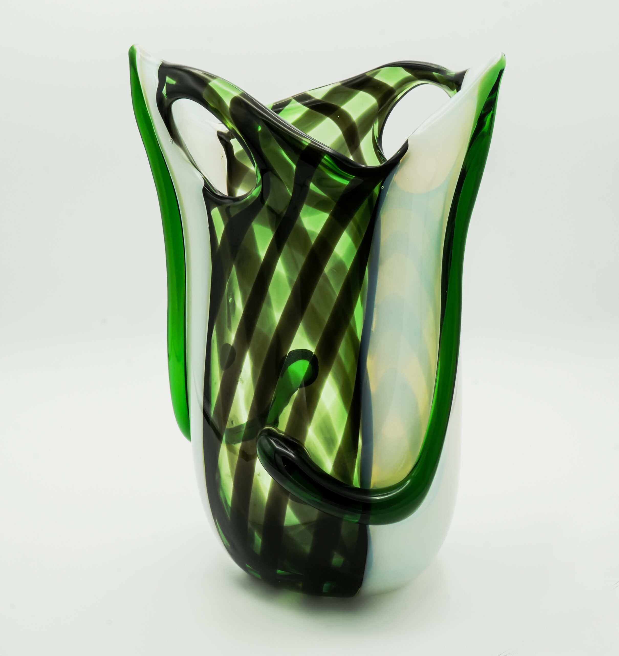 Vase with an abstract shape in green, opaline and intertwined black internal inserts.