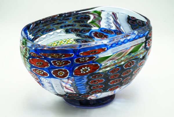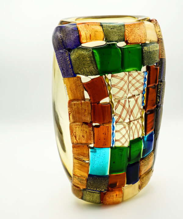 Flower vase made with white filigree canes and zanfirico canes of different colors.