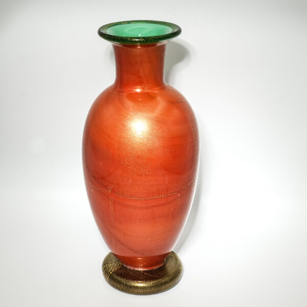 Coral colored amphora-shaped vase with 24 carat gold leaves.
