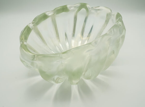 Crystal-coloured oval cup, very heavy, with wide ribbed print and iridescent effect