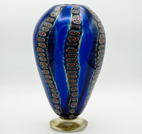 Carafe-shaped vase made with white filigree canes and blue zanfirico, 24-karat gold base.