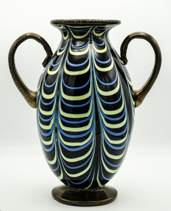 Amphora-shaped vase worked with the “Phoenician” technique, blue and yellow spirals.
