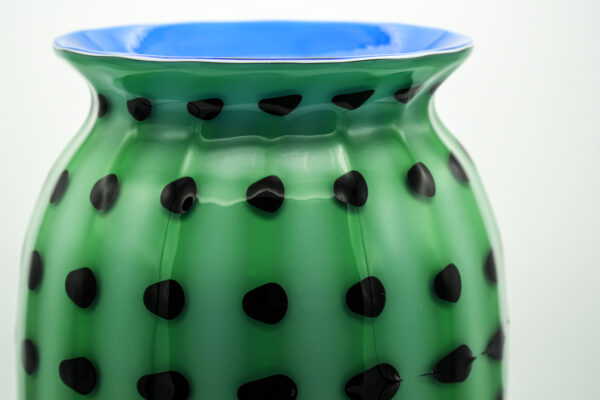 Green triumph vase with blue interior, black spiral all around the body worked with a special technique.