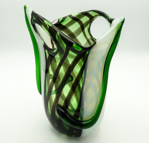 Vase with an abstract shape in green, opaline and intertwined black internal inserts.