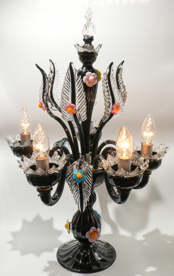 Black and crystal table chandelier with fractured leaves and paste flowers on the palm.