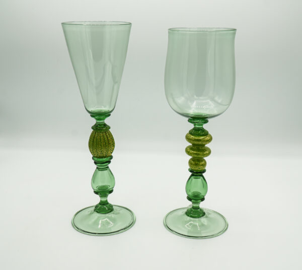 Glass with a flared green bowl, in the center we have a 24-karat gold swan / dolphin.