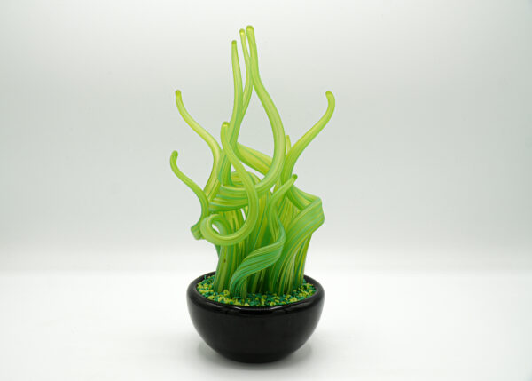 Satin green plant, with branches that yearn for immensity with a black bowl-shaped base containing ground glass of the same color as if it were soil.