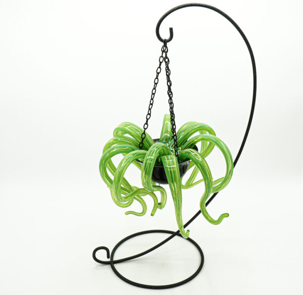 Plant in the shape of a weeping salige resting on a base in the shape of a black watch glass.