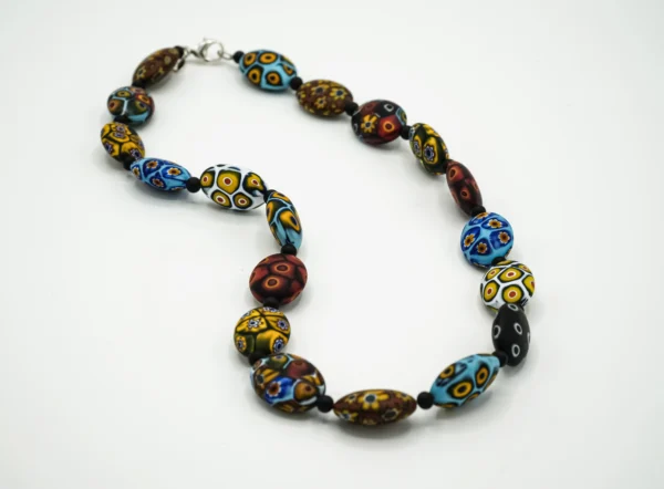 Multicolored amphora-shaped vase with vertical colors, black lampwork inserts