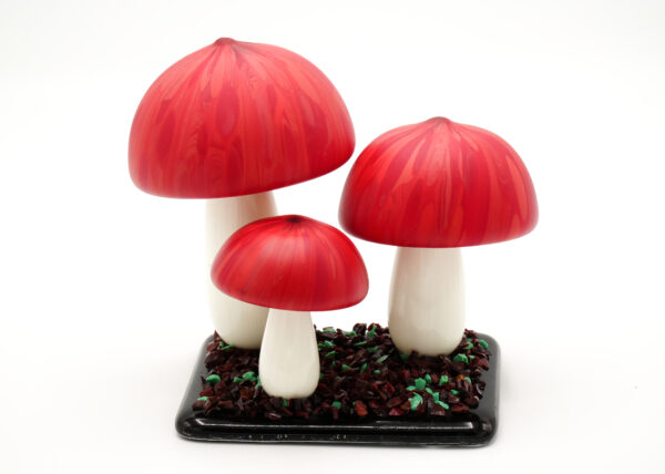Ornamental “porcini” type mushrooms made with opaque white stem an opaque red cap with various shades