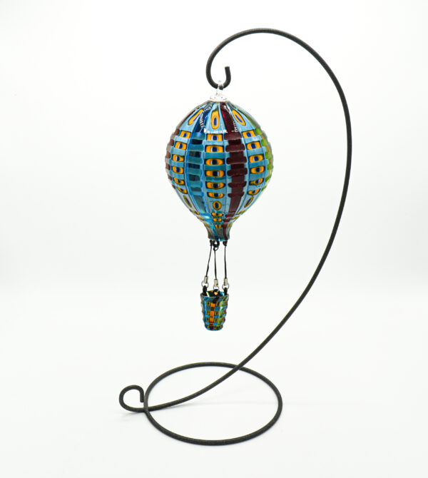 Small hot air balloon with wrought iron frame worked with different colored rods.