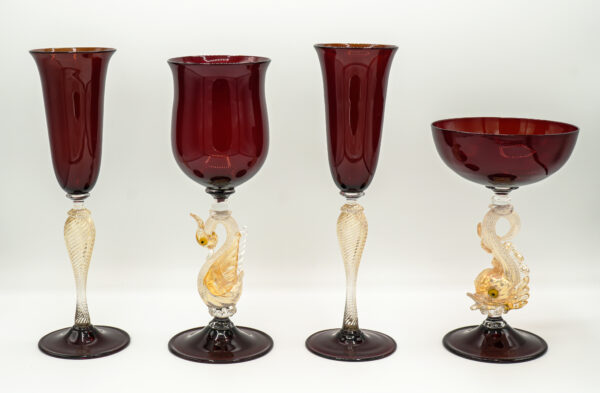 Various collectible glasses in Titian red with stem, dolphin, swan, twisted, in 24 carat gold
