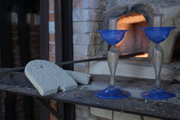 Pair of blue candlesticks with body made with 24-karat gold twisted workmanship.