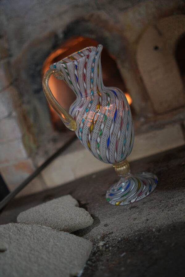 Spectacular carafe, made with white filigree canes and multicolored zanfirico. On the upper part, a handle hot-attached in 24-karat gold makes its appearance.