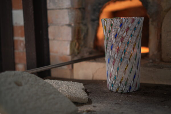 Flower vase made with white filigree canes and zanfirico canes of different colors.