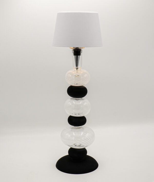 Modern lamp that can also become a candlestick made of flattened filigree balls and satin black balls